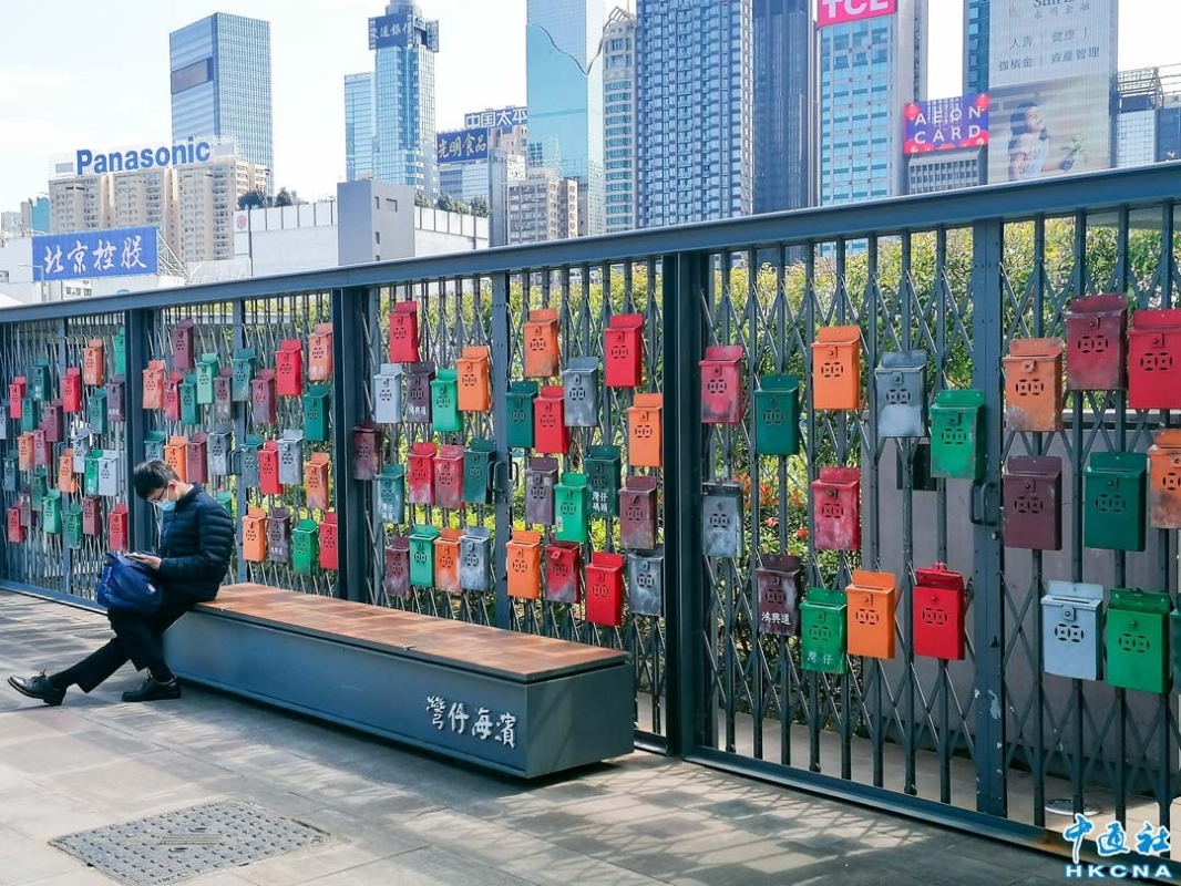 早春二月,香港灣仔新碼頭環境舒適,吸引不少遊客在此休閑。(香港中通社記者洪少葵攝)