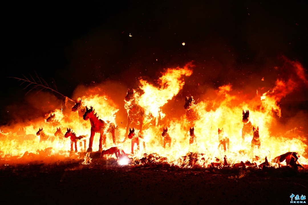 台灣嘉義縣鹿草圓山宮元宵火馬祭2月15日晚上盛大舉辦,重現傳統儀式,祈求國泰民安,風調雨順。鹿草圓山宮“放火馬”是清代開始就有的除疫儀式,中斷60年後,於2021年再次恢復舉辦。儀式開始,乩童請王孫大使降駕,民眾們一起拉著火馬巡禮,在民眾的期待中,點燃延伸至火馬堆的炮竹,將火馬引燃,趕走厄運,隨後是圓山宮準備的煙火秀。 香港中通社圖片