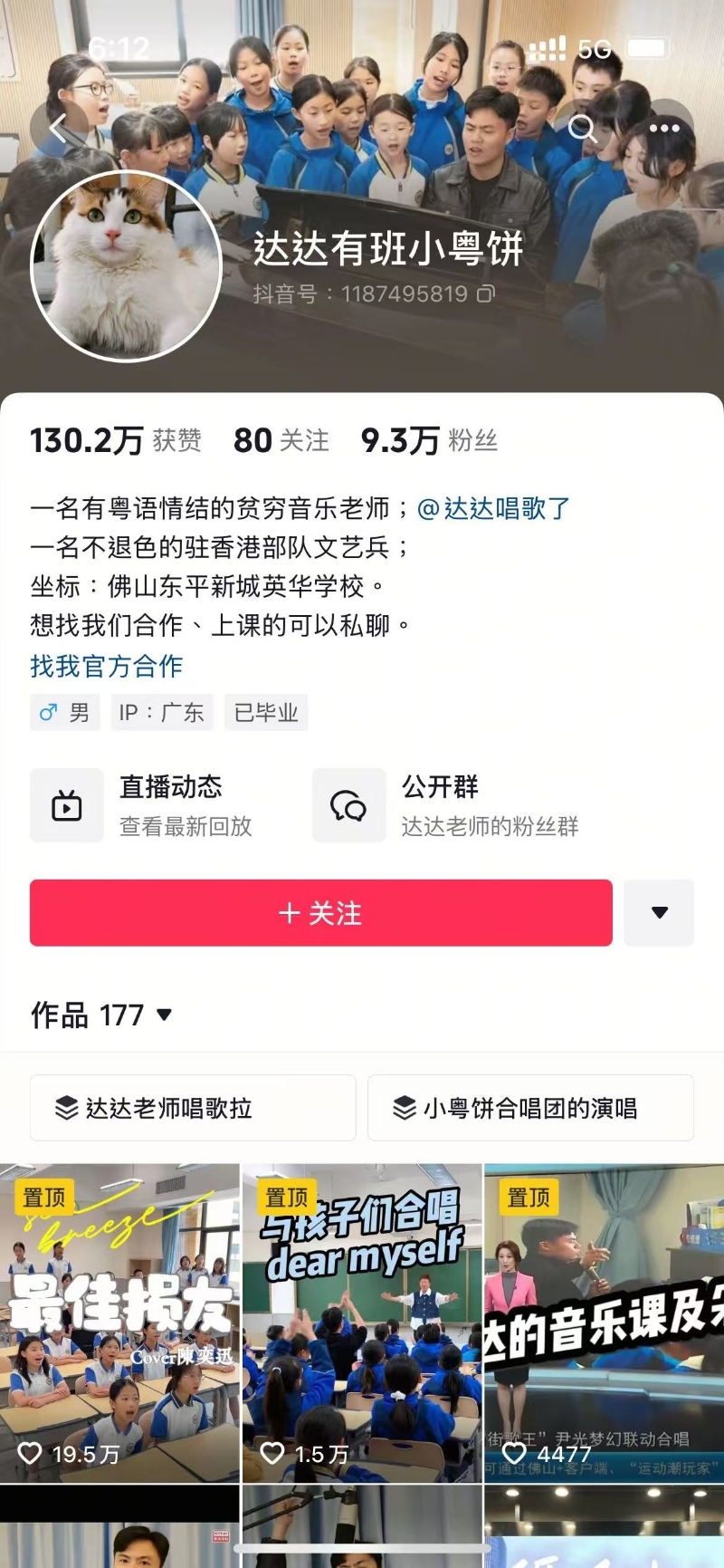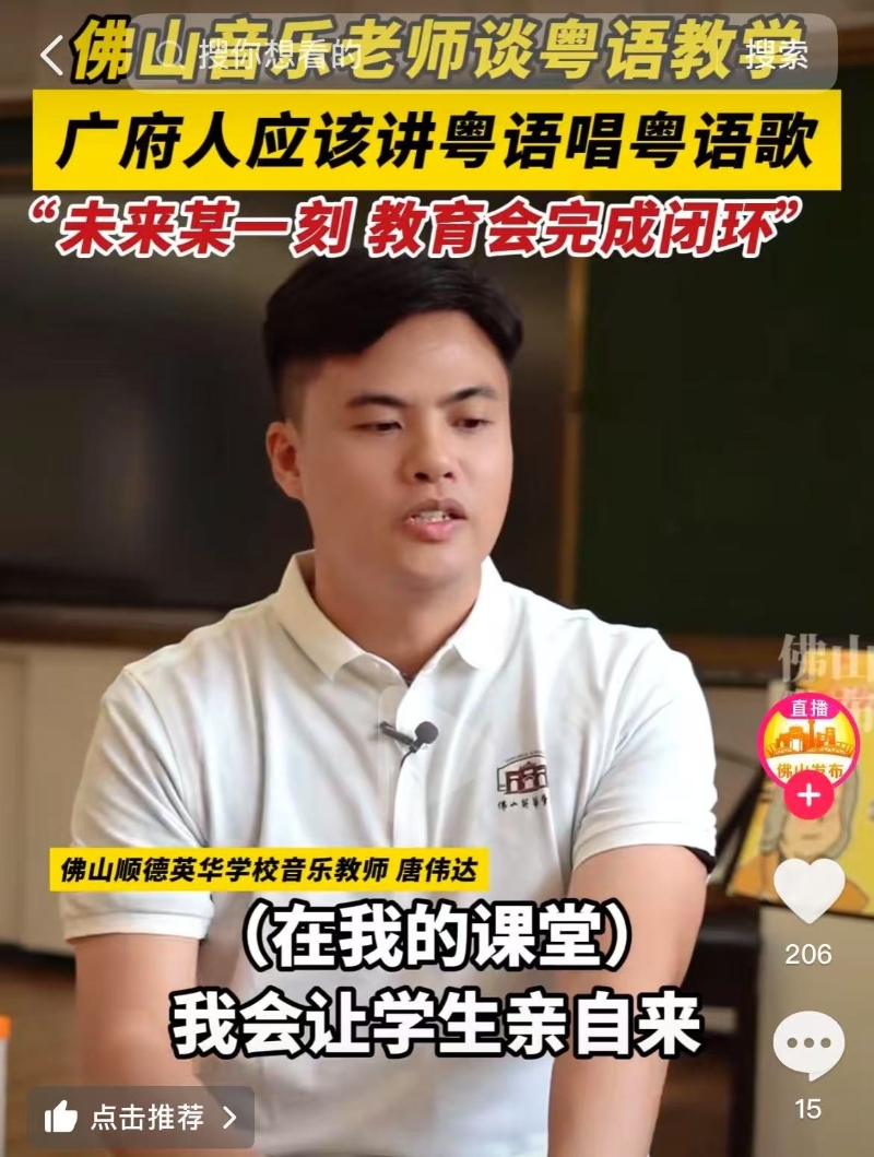 社交平台截圖 在佛山土生土長的唐偉達從小就聽廣東歌,在香港服役4年加深了對粵語歌的感情。他說,現時很多佛山小朋友不熱衷、甚至不太懂得講粵語,希望帶起一種風氣,讓大家知道還有很多人喜歡講粵語。 在唐偉達任教的學校內,低年級和高年級學生可分別免費選修粵語童謠和粵語歌課程,起初課程反應一般,不多學生報讀,後來越來越多家長支持,學校更贊助學生零食、登台服裝等,選修的學生逐漸增加。(完) 【編輯:徐嘉儀】