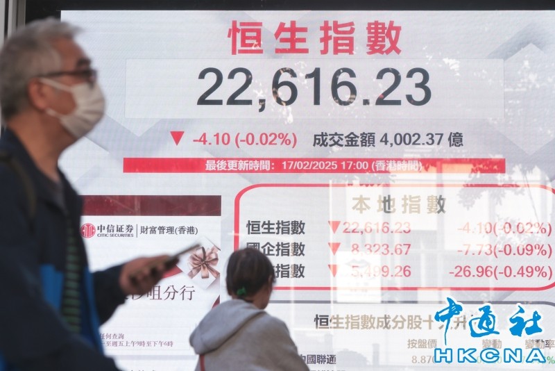 香港中通社2月17日電(記者 徐嘉儀)港股連升五周累漲3556點後,17日現多空爭奪,全日波幅逾657點,恆生指數收市跌4點,報22616點。大市成交額逾4002億港元。