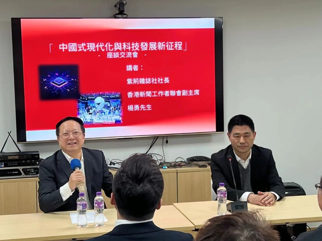 香港新聞網2月18日電 2025年2月18日,香港新聞工作者聯會在北角柯達大廈會所舉辦了“中國式現代化與科技發展新征程”座談會。此次活動由香港新聞聯主席李大宏主持,紫荊雜志社社長、香港新聞聯副主席楊勇作為主講嘉賓,与各位理事及参会者进行了深入的交流与分享。