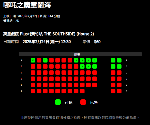 香港電影售票網站HKMovie網站截圖 《哪吒2》上映首日已大收657萬港元的票房,成為港澳動畫電影史上的開畫票房冠軍。23日中午,香港四大發行商聯合發佈,表示票房已衝破1000萬港元。場次排片頻次極高,甚至有市民笑稱比公交車發車時間還頻密,到接下來的週六,已排片的《哪吒2》有一半場次售罄,龐大的市場需求與院線的排片“雙向奔赴”。