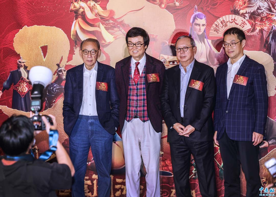 2月18日,《哪吒之魔童鬧海》香港首映禮在銅鑼灣舉行,並將於2月22日在港澳院線上映。圖為英皇集團主席楊受成(左起)、東方影業主席黃百鳴、麗新集團主席林建岳、銀都機構總經理丁凱。(香港中通社記者 曹文毓攝)