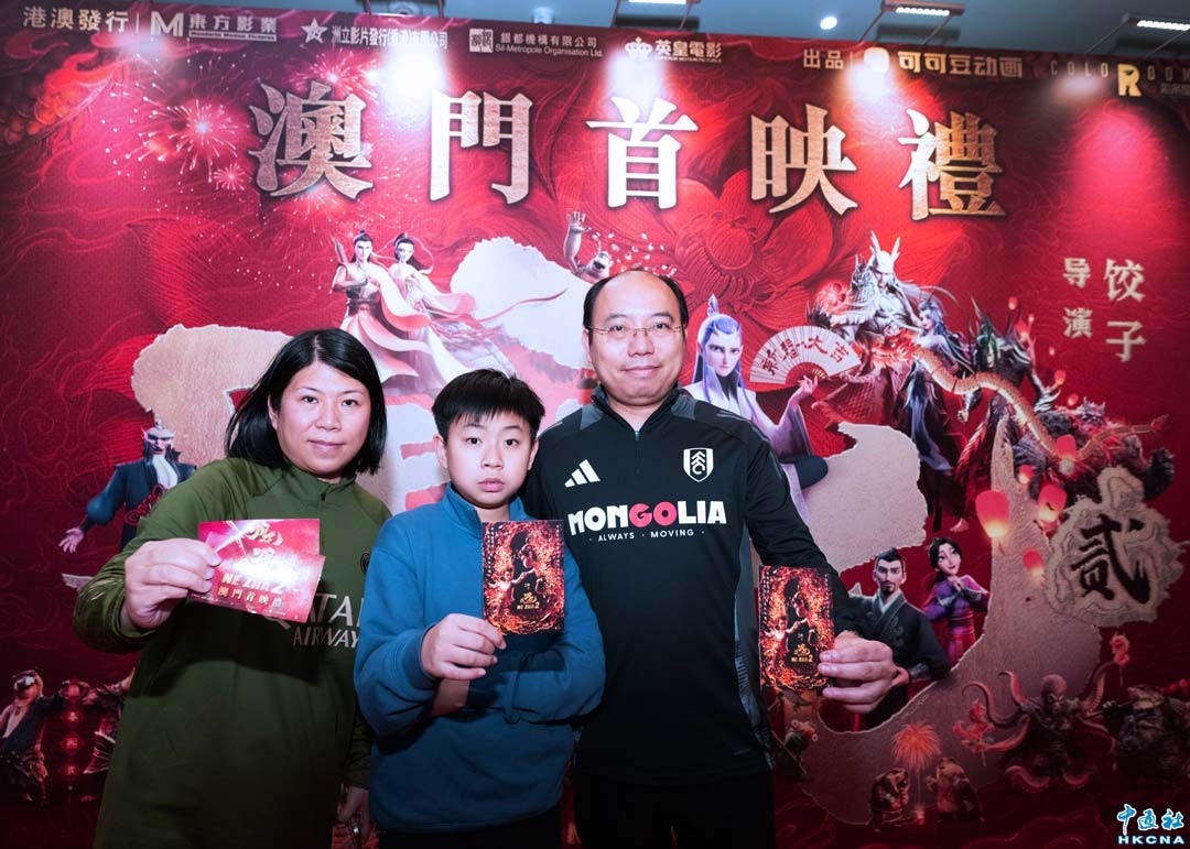 2月19日晚,動畫巨製《哪吒之魔童鬧海》澳門首映禮在英皇戲院(澳門葡京人)舉行。首映禮由東方影業、洲立影片、銀都機構及英皇電影四大公司聯合舉辦,影片於2月廿二日起在港澳地區全面上映。香港中通社圖片