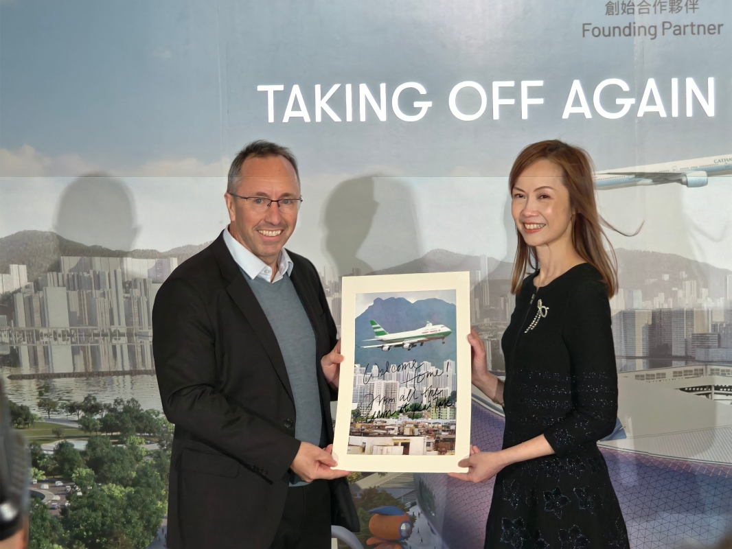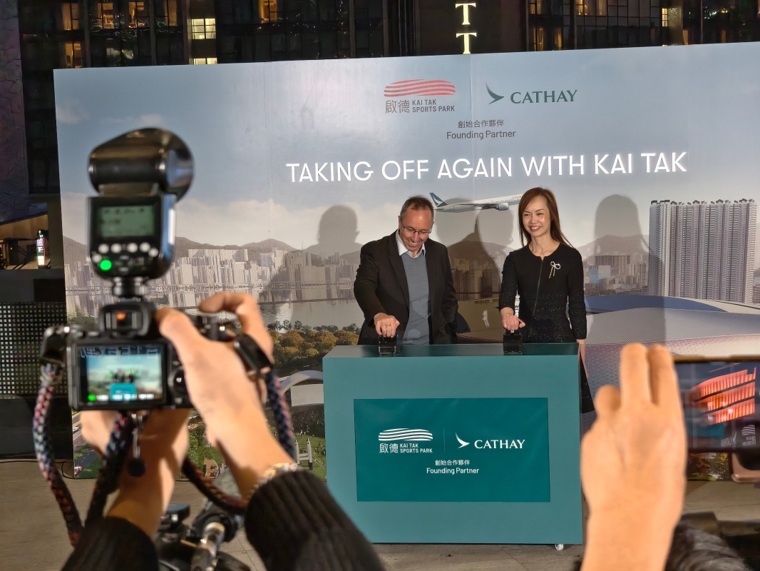 啟德體育園行政總裁莊澤基(左)國泰顧客及商務總裁劉凱詩(右)(香港中通社記者 梁嘉軒攝) 因此與啟德體育園的合作,除了是重回舊地之外,活動主題的“與啟德再次起飛”(Taking Off Again with Kai Tak)更體現出啟德體育園會承先啟後,再次成為香港在世界上的名片。 自1946年起至啟德機場結束運營的50多年間,國泰航空在啟德機場升降了無數次的起降,啟德機場的最後一趟航班由國泰航空執行。 啟德體育園行政總裁莊澤基致辭時表示,期待啟德體育園與國泰的合作關係長存。