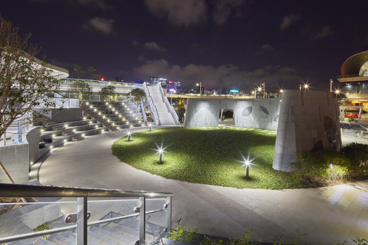 啟德空中花園夜間照明圖。(圖源:政府新聞處) 啟德空中公園位於啟德承豐道33號啟德郵輪碼頭頂層平台,其設計概念源自昔日啟德機場,勾起不少市民對舊機場的集體回憶,現為啟德發展區的嶄新地標。公園佔地2.3萬平方米,設有多項靜態設施,包括中央草坪、觀景平台、水景花園及噴泉廣場等。 空中花園的中央行人路劃分為春、夏、秋、冬四個主題區,種植超過80種花草樹木,在不同季節綻放不同的花朵,四時轉換,豐富市民的觀賞體驗。據悉,花園亦是一條“綠色連接通道”,設有多條樓梯及升降機,把承豐道附近多個地標連繫起來,包括啟德郵輪碼頭、啟德跑道公園、日後的都會公園和旅遊中樞,以及未來的海濱長廊。晚上,市民亦可在柔和燈光和水池襯托下,欣賞維多利亞港與東九龍一帶的璀璨夜景。 啟德Airside商場