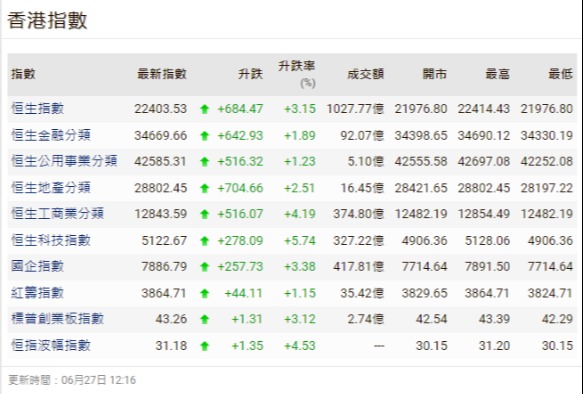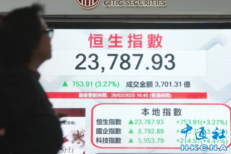 香港恒生指數大漲753.91點,報23787.93點。香港中通社圖片 當天,恒指高開204點,報23238點。在維穩買盤扶持下,大市出現明顯反彈,午後曾最多升逾900點。恒指最終收報23787點。 國企指數升293點或3.5%,報8792點;科技指數升254點或4.5%,報5953點。新一份財政預算案與創科、人工智能相關的內容篇幅增加,科技股大漲,帶動大市上揚。 龍湖集團升10.7%,是表現最好藍籌;石藥集團跌4.2%,為表現最差藍籌。權重股及科技股帶動市場,美團升近10%;京東升逾8%;小米漲近6%創新高;阿里巴巴漲近5%。半導體股多數走高,中芯國際升5.9%;晶門半導體升1.7%。香港將增加飛機乘客離境稅,攜程漲3%。 香港股票分析師協會副主席郭思治對中通社記者分析,各組平均移動線排列已回復標準的升市模式,有利短期後市發展。只要大市成交金額保持暢旺,在動力配合下,大市有機會尋季內新高。大市自1月13日低位18671點開始升浪,至少可延續6至8周,即大市升勢有機會延續至3月中旬。(完) 【編輯:林曉惠】
