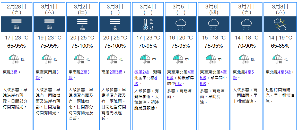 香港未來7天濕度爆表 香港天文台截圖 “回南天”指當東北季候風有所緩和時,廣東沿岸地區轉吹偏南風,把海上較為溫暖潮濕的空氣帶到陸地。由於牆身或地板表面溫度同樣偏低,空氣中的水汽也可能在物件表面凝結成小水珠,令牆身或地板“出水”。2月28日至3月7日,香港濕度最高均達95%及以上,3月2日及3日最高濕度更預計達到100%。 有市民早已啟動除濕機,稱“感覺床都變得潮乎乎的”;衣櫃、櫥櫃裡,也已放好了除濕盒、除濕袋或乾燥劑。不少媒體亦發佈資訊文章,提醒市民在使用除濕機等電器時注意安全隱患,小心發生漏電等意外。 天文台表示,東北季候風在未來一兩日逐漸被一股海洋氣流取代,廣東沿岸氣溫逐步回升,本周末期間及3月3日有機會出現回南天氣,早晚潮濕有霧,日間溫暖。料一道冷鋒會在3月4日橫過華南。受隨後的東北季候風及其補充影響,下周中至後期該區氣溫逐步下降,天氣顯著較涼,多雲有雨。(完) 【編輯:林曉惠】