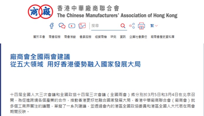 香港中通社資料圖片 十四屆全國人大三次會議和全國政協十四屆三次會議(全國兩會)將分別於3月5日和3月4日在北京召開。廠商會所草擬的建議,將通過會內的港區全國政協委員和港區全國人大代表在兩會期間反映。 廠商會的建議圍繞“鼓勵內地企業通過香港‘出海’”“優化‘灣區標準’制定與推廣工作”“加強香港品牌在內地的權益保護”“加強內地與香港碳市場合作”及“促進國家ESG標準體系建設”五大領域。 在鼓勵內地企業通過香港“出海”上,廠商會建議內地有關部門積極倡導並支持內地企業視香港作為“出海”的首選指揮中心與增值服務平台;從簡化業務備案及核准的流程、外匯資金靈活調配、以及便利人員跨境流動管理等多方面,為內地企業“走出去”鋪設順暢通道。 同時,廠商會建議,鼓勵各地的行業協會與商會組織代表團,或由政府商務部門牽頭赴港舉辦地方特色產品、地理標誌或民族品牌的推介會與交流活動,協助內地企業進入香港市場和提升海外推廣的效益。 此外,廠商會也建議內地相關部門為赴香港參展或參加市場推廣活動的中小企業提供差旅資助和其他津貼;鼓勵企業來港舉行新產品“首發”活動,並提供資金扶持及海關快速通道等便利措施。 同時,廠商會建議內地相關部門與香港對口機構加強合作,完善企業經香港“出海”的信息收集和傳播機制,加大對香港供應鏈管理增值服務優勢的宣傳力度,鼓勵內地企業採用香港高品質專業服務。 在優化“灣區標準”制定與推廣工作上,廠商會表示其近年積極參與多個領域的“灣區標準”編制工作,但注意到相關的參編和評審流程可進一步規範化和優化收到港資企業反映,認為目前缺乏使用“灣區標準”的誘因。 因此廠商會建議,要善用香港國際化和制度規範的優勢,邀請更多香港專家學者和業界代表參與標準的編制及評審;一些香港具有優勢的行業和產品,可考慮直接由港方主導定標工作,從而加快“灣區標準”與國際接軌和兼容。 同時,廠商會表示,要推動在大灣區市場內率先實現“灣區標準”與內地海關清關標準和市場准入標準的整合,真正做到“三標合一”。粵港澳三地政府聯合公布一批共同認可的第三方檢測認證機構名單,企業若取得相關認證機構出具的“灣區標準”合規證明,有關產品進入內地時可“一紙通行”,省卻重複的標準考核與驗證,增強業界採用“灣區標準”的積極性。 此外,廠商會認為要進一步加強“灣區標準”在國內外的推廣和使用;對於已公布的標準,應在大灣區試行後盡快推廣至全國其他地區,同時爭取讓“灣區標準”納入國際認可的標準體系中,特別是新興產業的全新標準,以提高國家在國際標準制定中的話語權。 在加強香港品牌在內地的權益保護上,廠商會建議各級市場監督部門應對企業在宣傳及銷售活動中使用“香港”相關字眼的個案,加大抽查力度以及要求企業提供切實的證明文件;並嚴厲打擊侵犯香港品牌合法權益的違法行為,維護公平競爭的市場秩序。 同時,廠商會期望內地相關單位能支持香港商協會在內地舉辦更多推廣和宣傳香港品牌的活動,提升內地消費者購買“正版正貨”香港品牌的意識與辨別能力。 此外,在處理與香港品牌相關的商標註冊、保護、合規以及糾紛處理等事宜時,可以“一國”原則,將香港品牌或商標在香港本土使用的情況和知名度納為參考因素;為“中華老字號”的評選設立“香港專場”,讓一些歷史悠久、具重大影響力的香港品牌可循特別申請渠道,參與相關的資格認定。 此外,廠商會建議內地和香港政府部門進一步深化協調與合作,確保兩地地理標誌品牌在對方市場的合法和恰當使用。 在加強內地與香港碳市場合作上,廠商會建議內地主管部門加強頂層設計,結合我國實際情况,制定並出台碳排放相關的信息核算、認證、核查等標準和披露規則;率先在重點行業和產品領域建立全國統一的碳足迹和碳標識制度,實現與國際規則銜接和互認。 同時,為提高碳市場的信任度和透明度,廠商會建議當局應鼓勵參與企業尋求獨立的第三方專業機構協助,引入合資格核查認證機構為企業或項目出具證書,鼓勵包括香港在內的境外第三方核查認證機構為內地企業提供碳審計服務。同時,可考慮在CEPA框架下為從事碳審計、碳金融、碳管理的香港企業提供便利化安排,以加強碳服務領域的跨境合作。 此外,廠商會表示探索建立面向居民和中小企業的碳普惠體系,例如通過“碳積分”獎勵等方式,激勵全社會積極參與低碳行動,擴大碳市場的影響力。 同時,廠商會建議探討深化內地與香港碳交易所合作,以及建立碳市場的互通機制,以促進碳排放權的跨境交易,藉此為內地碳市場引入國際資金,並提升國家碳市場的國際化水平。 最後,在促進國家ESG標準體系建設上,廠商會建議深化內地與香港在ESG領域的理論探索與實踐上的合作,攜手構建一套既彰顯中國特色、且與國際標準相銜接的ESG標準體系及信息披露規則,並積極向國際社會推介;並透過促進兩地企業交流,共同提升ESG實踐水平。 此外,廠商會建議針對上市公司與大型企業、中小企分別制定具差異化的ESG評價指標體系和披露規範;鼓勵中小企業通過自願簽署約章和訂立行動承諾方式,邁出實踐ESG的第一步。 同時,廠商會建議,對企業於ESG方面的投入給予稅收優惠,並針對ESG表