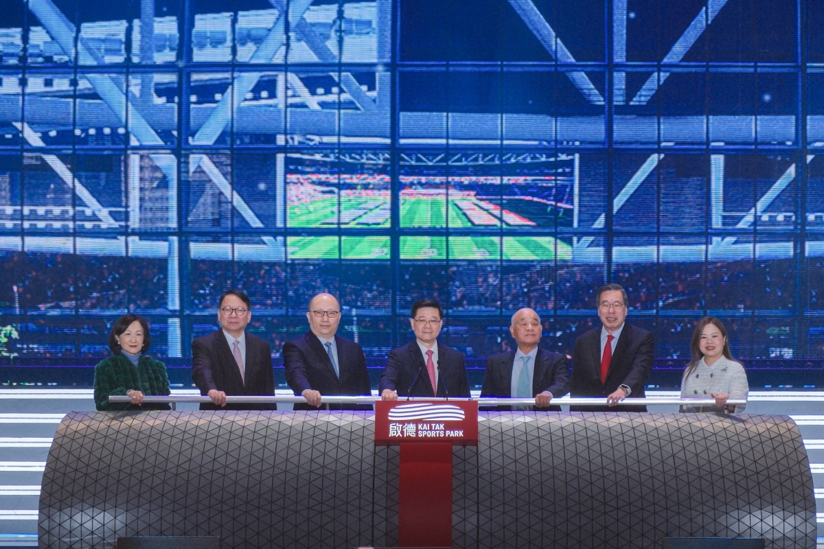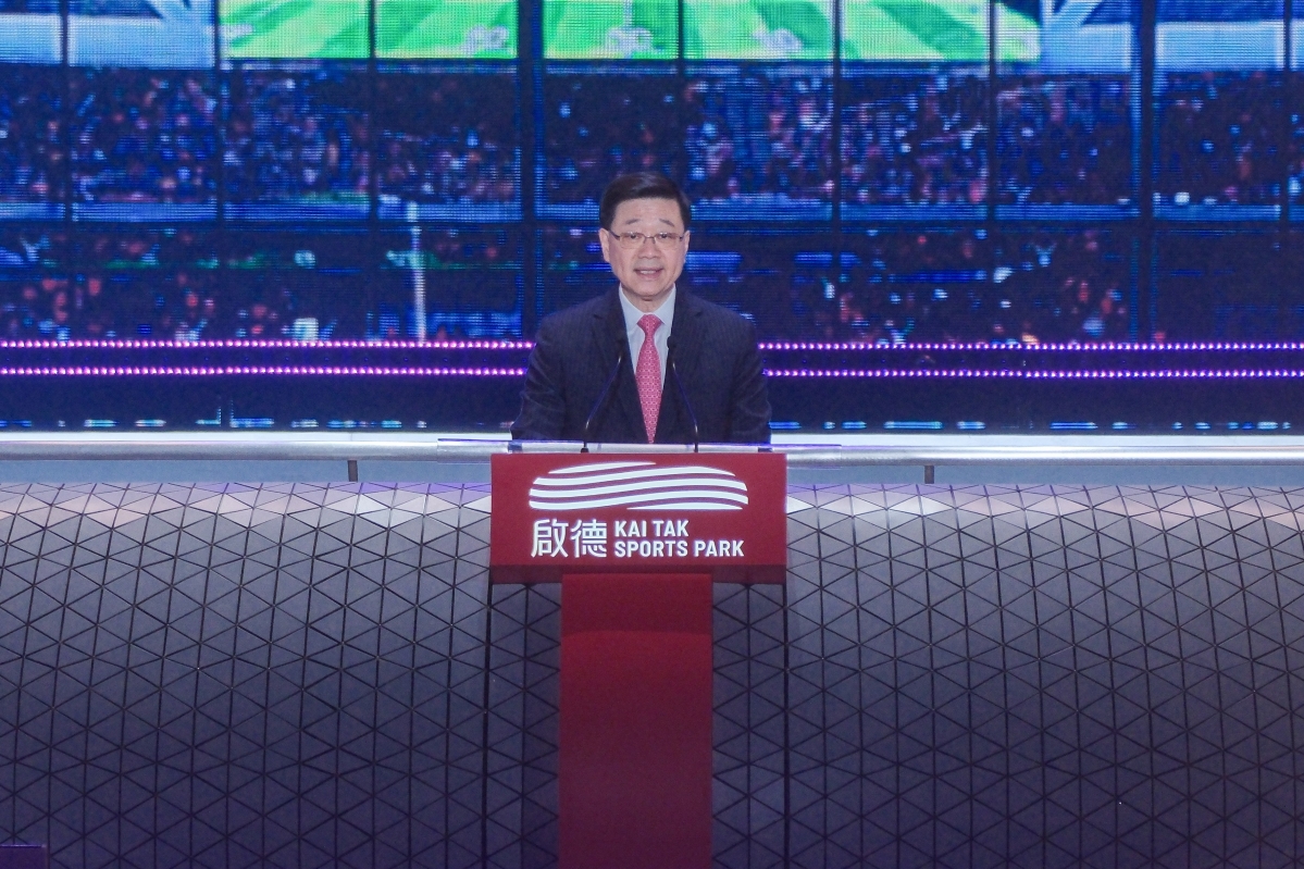 香港特區行政長官李家超(中)、香港中聯辦主任鄭雁雄(左三)等為體育園揭幕。
