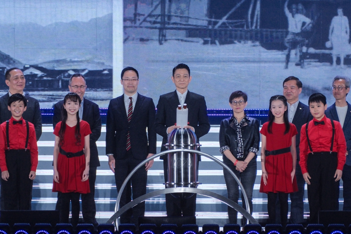 藝人劉德華(中)主禮時間膠囊儀式。