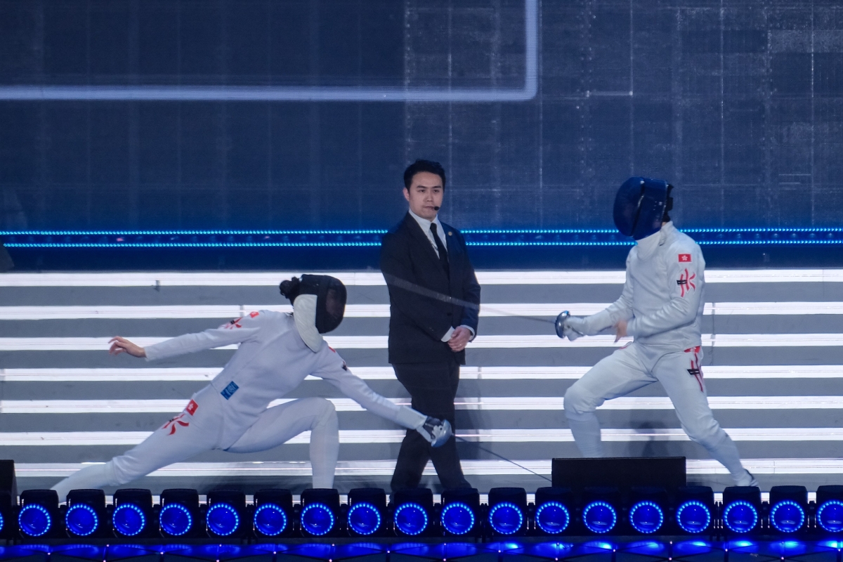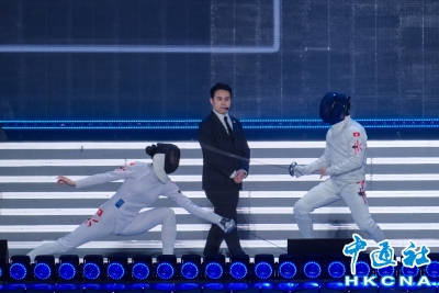 藝人甄子丹和香港擊劍運動員江旻憓“切磋”擊劍。