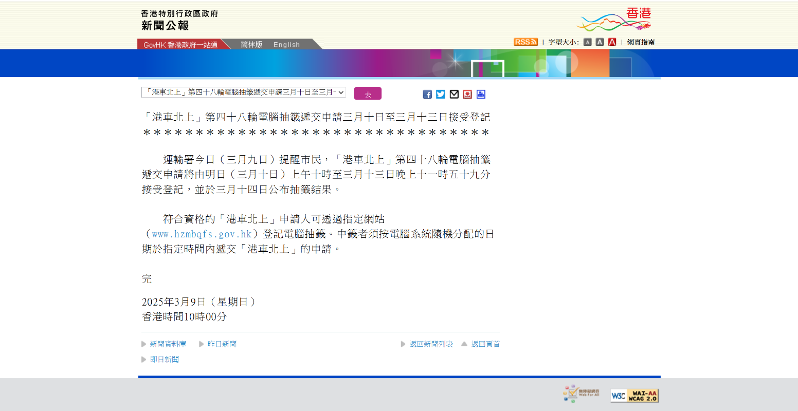 符合資格的“港車北上”申請人可透過指定網站(www.hzmbqfs.gov.hk)登記電腦抽籤。中籤者須按電腦系統隨機分配的日期於指定時間內遞交“港車北上”的申請。  (完)