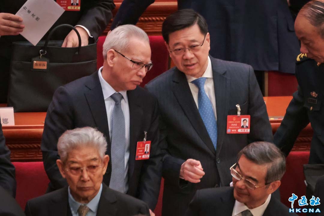 3月5日,十四屆全國人大三次會議開幕會在北京人民大會堂舉行,香港特區行政長官李家超和澳門特區行政長官岑浩輝列席會議。圖為會後,李家超、岑浩輝互相交流。(香港中通社記者 謝光磊攝)
