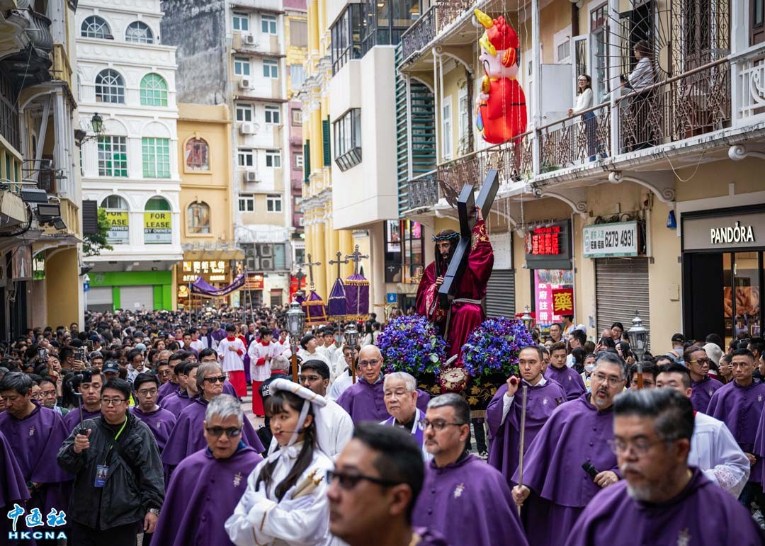 3月9日,澳門舉行苦難善耶穌像第二日出遊,教士們抬著耶穌像經過沿途所設多個“苦路處”,由主教座堂返回聖奧斯定教堂,吸引大批信眾參與並夾道圍觀。香港中通社圖片