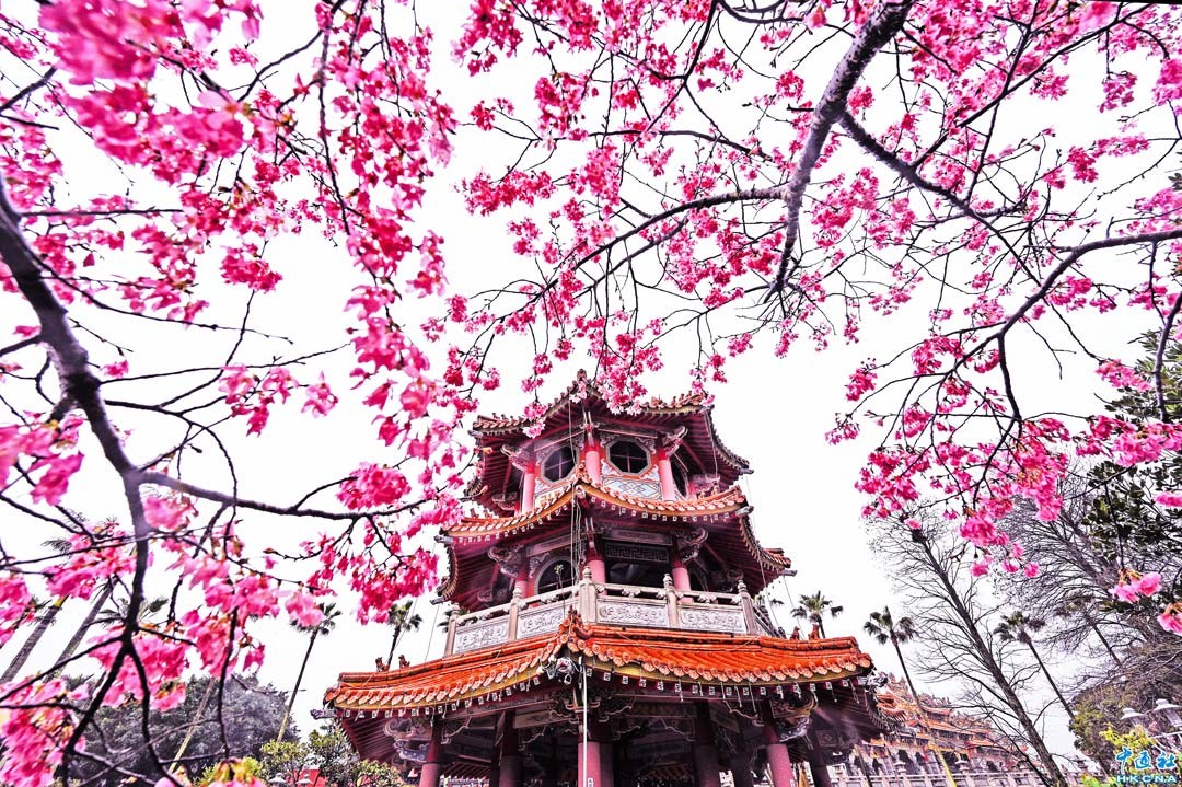 台灣新北市林口區竹林山觀音寺,粉嫩櫻花正盛開,讓人悠閒漫步在櫻花樹下,櫻花配宮廟建築吸引許多遊客到此拍照打卡。 香港中通社圖片
