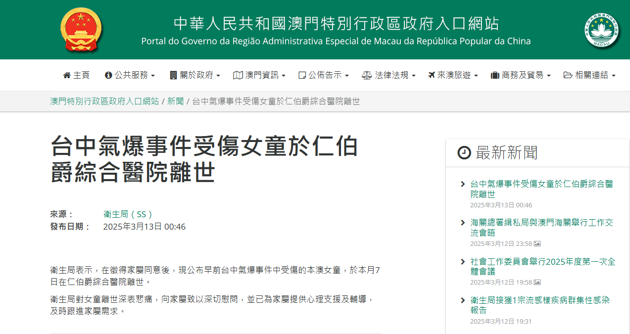 澳門特區政府網站截圖 澳門衛生局凌晨表示,征得家屬同意後公佈早前在台中氣爆事件中受傷的女童,於本月7日在仁伯爵醫院離世。當局對此深表悲痛,并向家屬致以深切慰問,在提供心理支援及輔導外,亦會跟進家屬的需求。 2月13日,台中市新光三越百貨發生氣爆事件,澳門2歲女童一家7口到澳門旅遊,被爆炸導致的高空墜物擊中,造成2死5傷,傷者中包括該名2歲女童。 女童2月26日乘搭醫療專機送返澳門,并由醫療團隊直接從機場護送至政府仁伯爵醫院,入住兒科深切治療病房。醫生當時表示,女童腦損傷非常嚴重,處於昏迷狀態,需靠呼吸機維持呼吸及心跳,院方會積極治療。 隨著氣爆事件滿一個月,台灣媒體稱事故原因依然不明,當局仍未有調查報告,台中市消防局長孫福佑昨日(3月12日)表示,掌握5項新事證 ,報告料月底完成並呈送台中地檢署。 台中地檢署同日表示,案發至今多次進入現場勘查、蒐證,累計已訊問33名證人,暫無人轉列被告,全案持續調查,以釐清責任歸屬。目前,肇事新光三越仍在停業,未知何時復業。 多名台北市議員稱,公共場所安全不能輕忽,市府應積極公佈調查報進度。 據悉,新光三越氣爆是台灣史上最嚴重的百貨安全事件。(完) 【編輯:丘志彬】