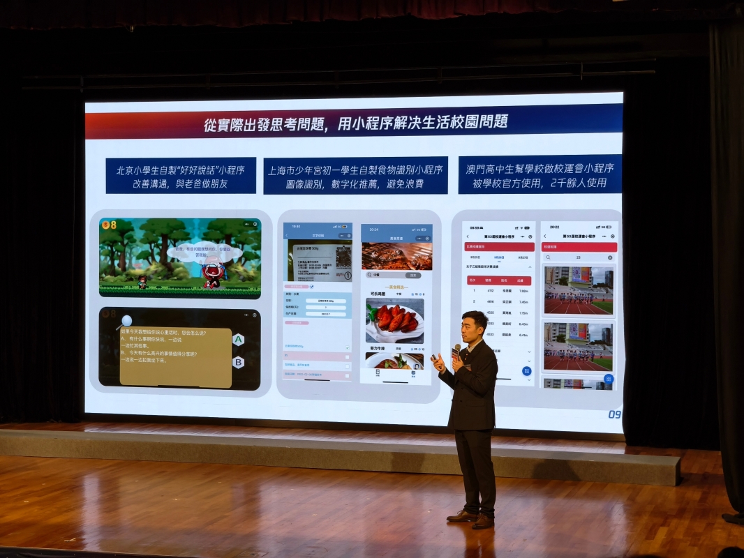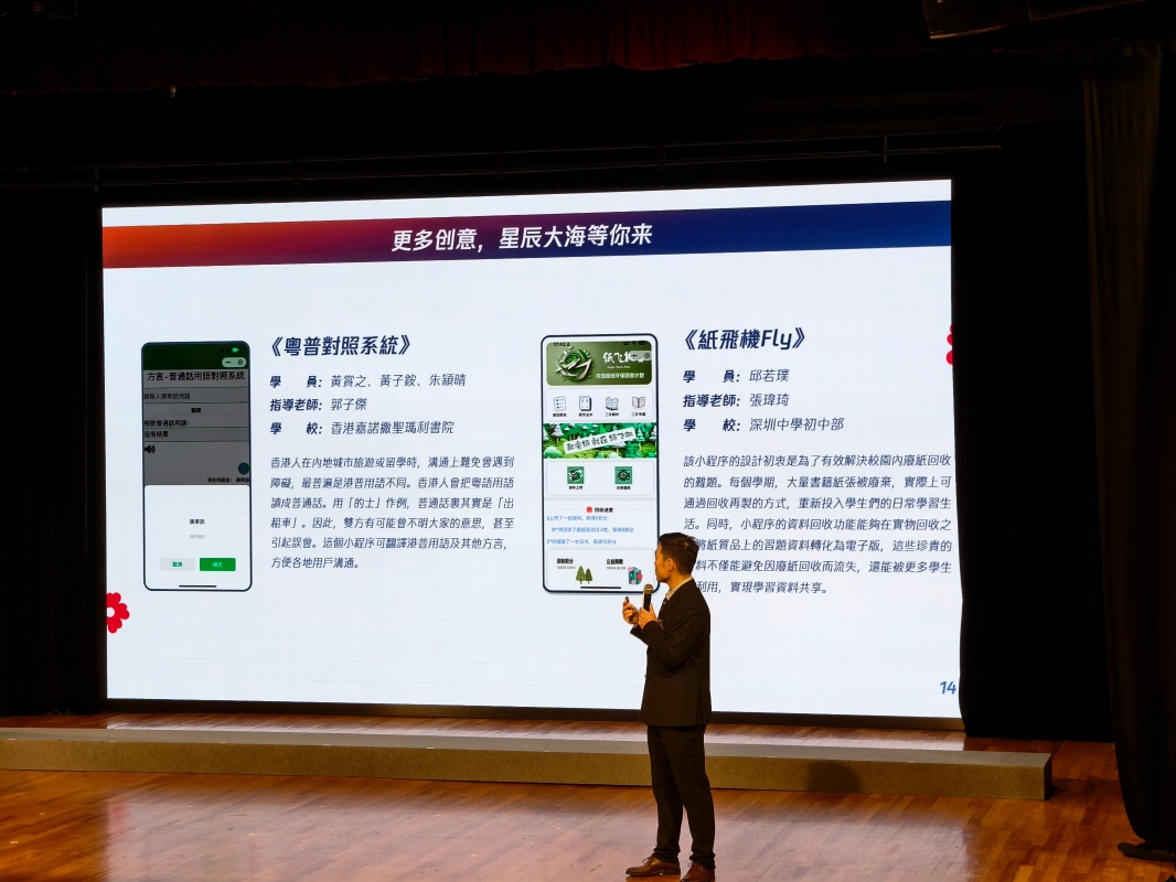 學生作品展示 (香港中通社記者 梁嘉軒攝) 另外,騰訊的代表也介紹了來自澳門培正中學團隊的作品,他們為該校校運會開發了賽事實況小程序,其功能完善,可以顯示賽果及賽事圖片,讓師生可以緊貼更投入地參與到這場校園盛事。 同時,為展現了小程序在公益上的潛力,騰訊代表向現場觀眾展示了多個小程序,其中包括一個普通話學習小程序。通過該小程序學習普通話的香港小學生廖曉彤告訴記者,這個小程序能夠非常有效地糾正她的普通話發音。(完) 【編輯:梁嘉軒】