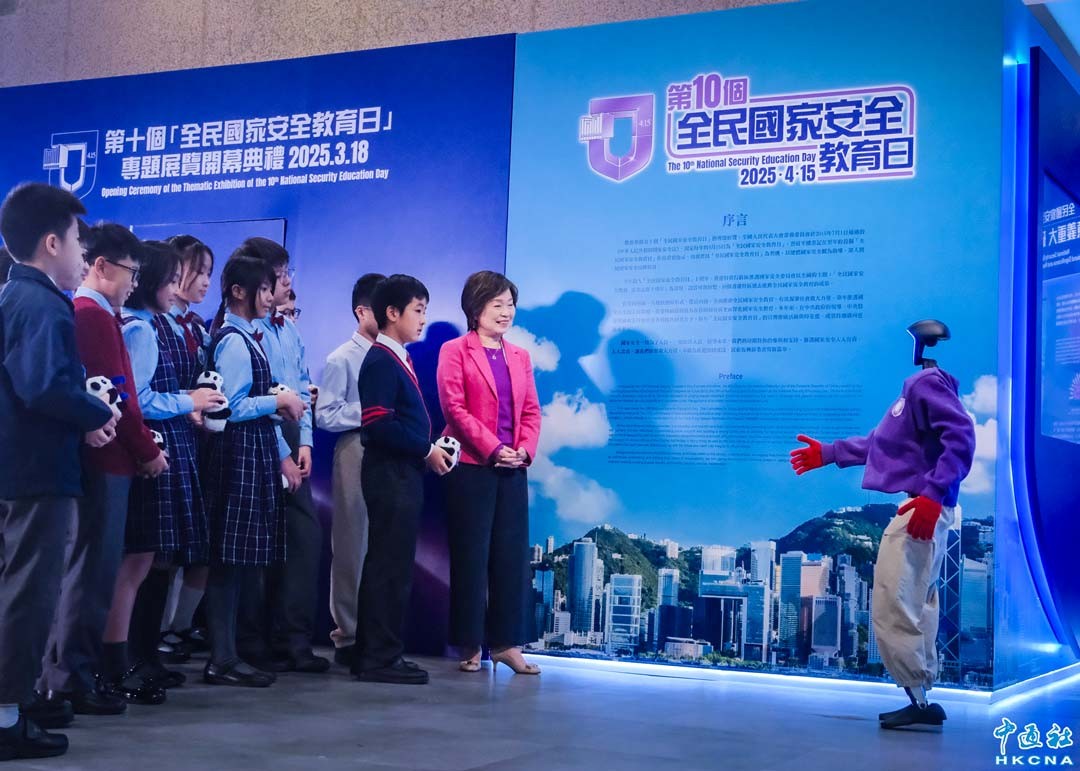 3月18日,第十個“全民國家安全教育日”專題展覽開幕典禮在香港歷史博物館舉行。專題展覽以全國性主題“全民國家安全教育 走深走實十周年”為引領,回顧國家和香港特區多年來在推動全民國家安全教育的發展,專題展覽將於3月19日起開放予公眾參觀。圖為機器人導賞員(右一)向香港特區政府教育局局長蔡若蓮(右二)和學生介紹展覽。(香港中通社記者 許其皓攝)