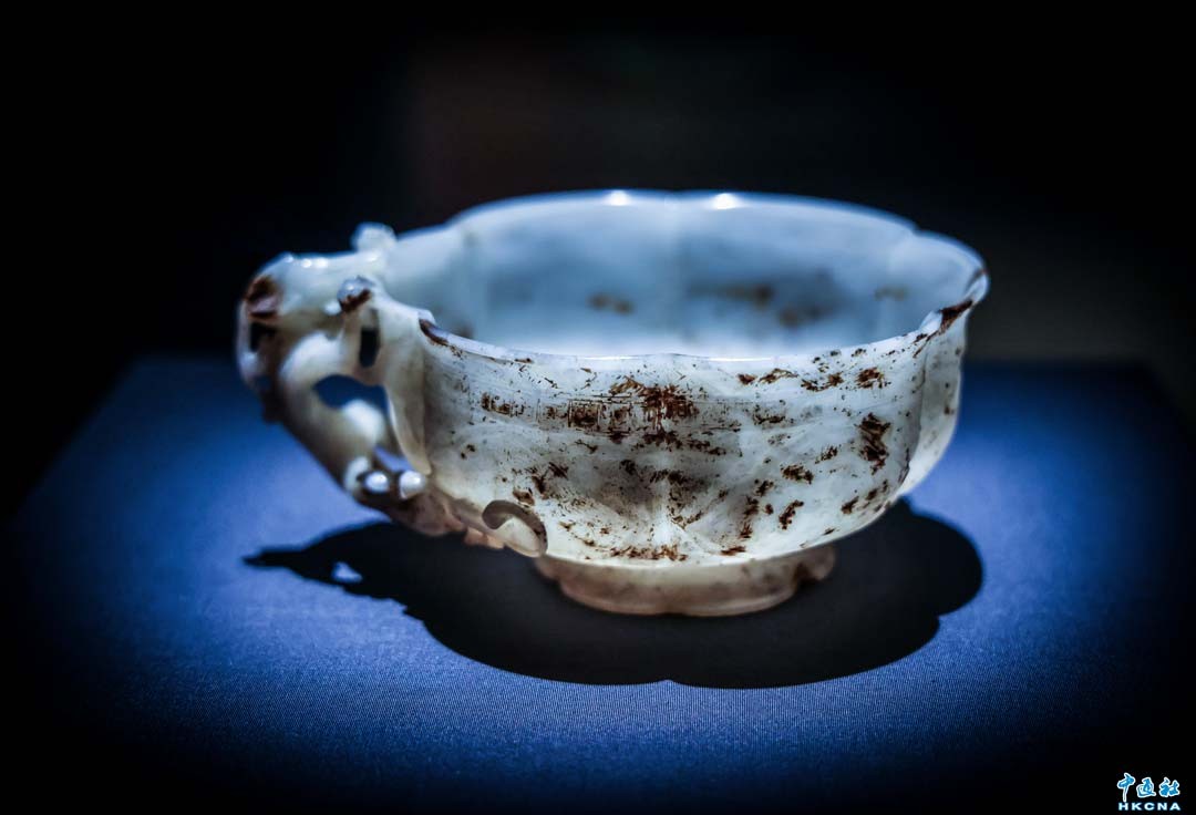 3月18日,香港故宮文化博物館舉行特別展覽“流動的盛宴——中國飲食文化”傳媒預覽。展覽將於3月19日至6月18日推出,是次展覽以嶄新的角度──“流動”為主軸,呈現並串聯中國五千年飲食文化中的重要特點。展覽精選逾 110 件珍貴文物,包括來自故宮博物院的8件中國國家一級文物,深入探索食物器具、飲食習慣和傳統風俗的演變,呈現中國千姿百態的飲食文化和生活面貌。圖為國家一級文物𧃍龍炳葵花式杯。(香港中通社記者 曹文毓攝)