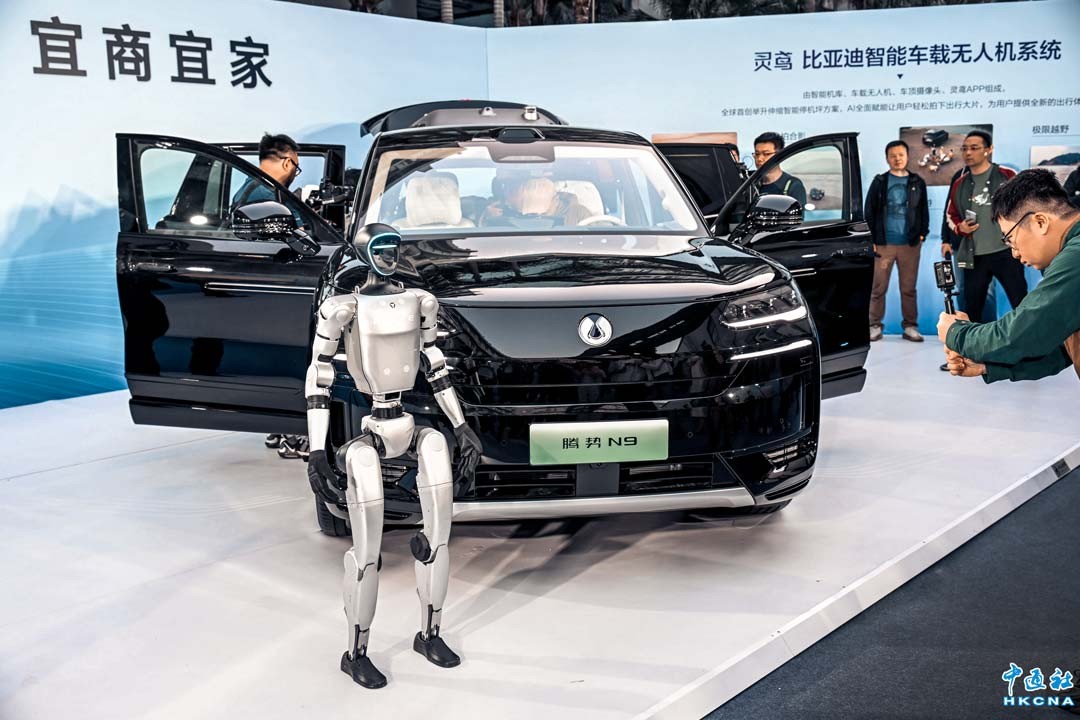 3月21日晚,比亞迪旗艦SUV騰勢N9上市科技之夜在深圳比亞迪全球總部舉行。作為全球首款搭載易三方的旗艦SUV,騰勢N9集優雅霸氣外觀、超大百變空間、頂級動力系統於一身,做到可城可野、宜商宜家,以科技新豪華重塑旗艦SUV價值新標杆。圖為人形機器人助力比亞迪新車上市。(聞子 攝)