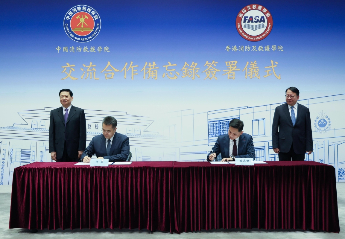 圖源:政府新聞處 此外,香港消防及救護學院與中國消防救援學院簽署交流合作備忘錄,旨在進一步深化合作,共同培訓高水準的消防救援人才,並推動消防救援技術的創新與發展。合作備忘錄由國家消防救援局副局長何寧以及消防處處長楊恩健簽署,並由王祥喜和署理行政長官陳國基見證。 兩地消防救援部門將在聯合培訓人才、深化專業訓練、學術與技術交流和重大課題研究等方面進一步鞏固和深化合作關係,共同開啓消防救援事業發展新篇章。 (完) 【編輯:譚暢】