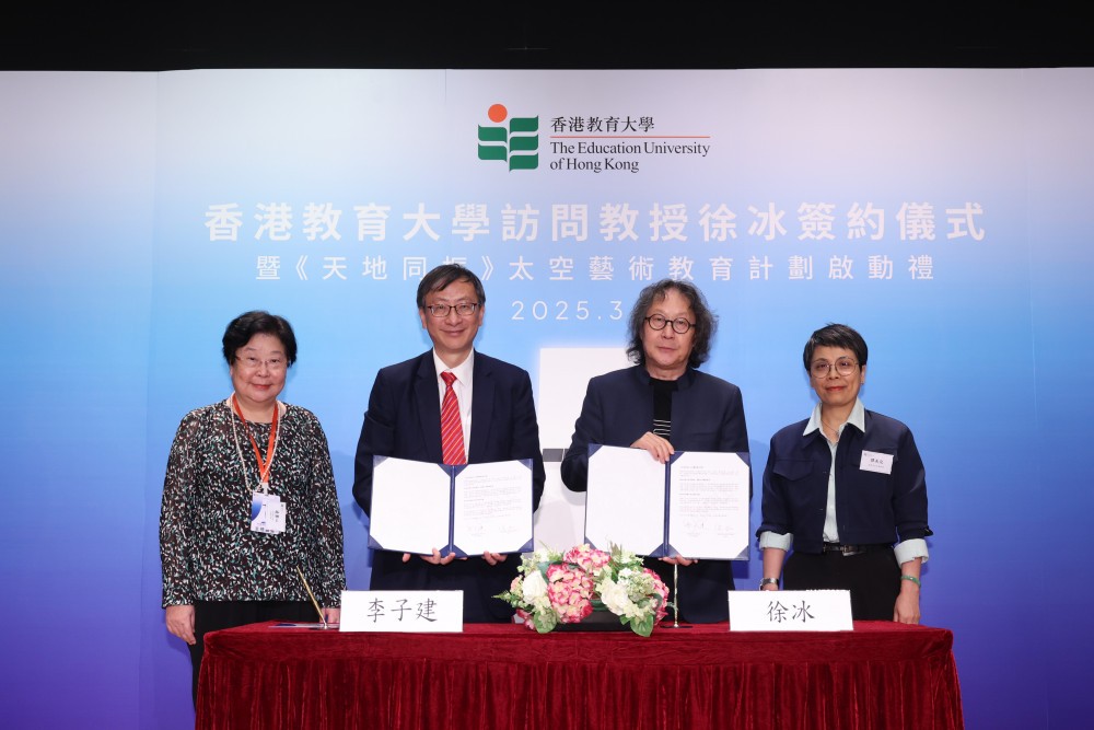 香港新聞網3月26日電 為培育年輕藝術人才,推動太空藝術科普,並促進STEAM 教育及未來教育,香港教育大學26日在教大大埔校園舉行聘任徐冰為訪問教授簽約儀式暨太空藝術教育計劃(《天地同框》計劃)啟動禮。 簽約儀式上,教大正式宣佈,聘請中國當代藝術家徐冰教授擔任文化與創意藝術學系訪問教授,任期一年。徐冰教授隨即與教大校長兼教育發展與創新學院院長李子建教授簽署協議,並由康樂及文化事務署副署長(文化)譚美兒女士與教大校董會司庫凌潔心女士共同見證。