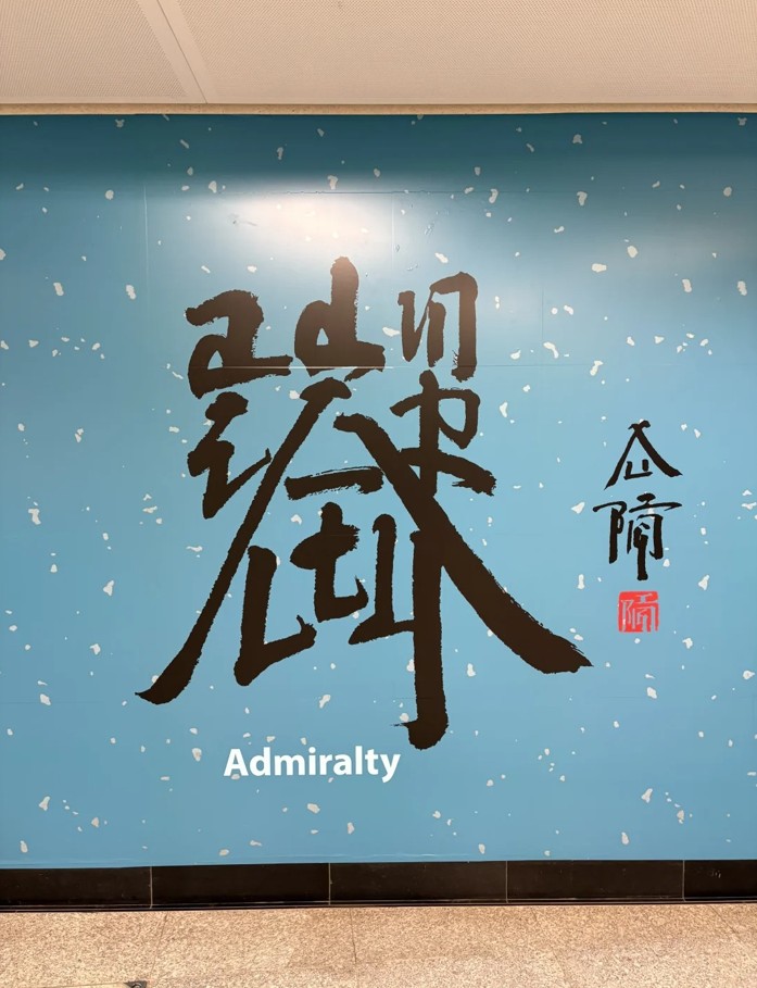 金鐘站內展示徐冰的作品,以金鐘站英文Admiralty創作。 真相揭盅後,不少網民都表示欣賞:“用中國書法寫英文,再砌返埋(組合拼接)用中文字方式表達,其實幾有藝術意味”、“幾得意,鍾意與否都可以當見識下別人的思維。”、“雖然我不懂藝術,但又覺得這個英文拼成中文寫法不錯。”(完) 【編輯:黃璇】