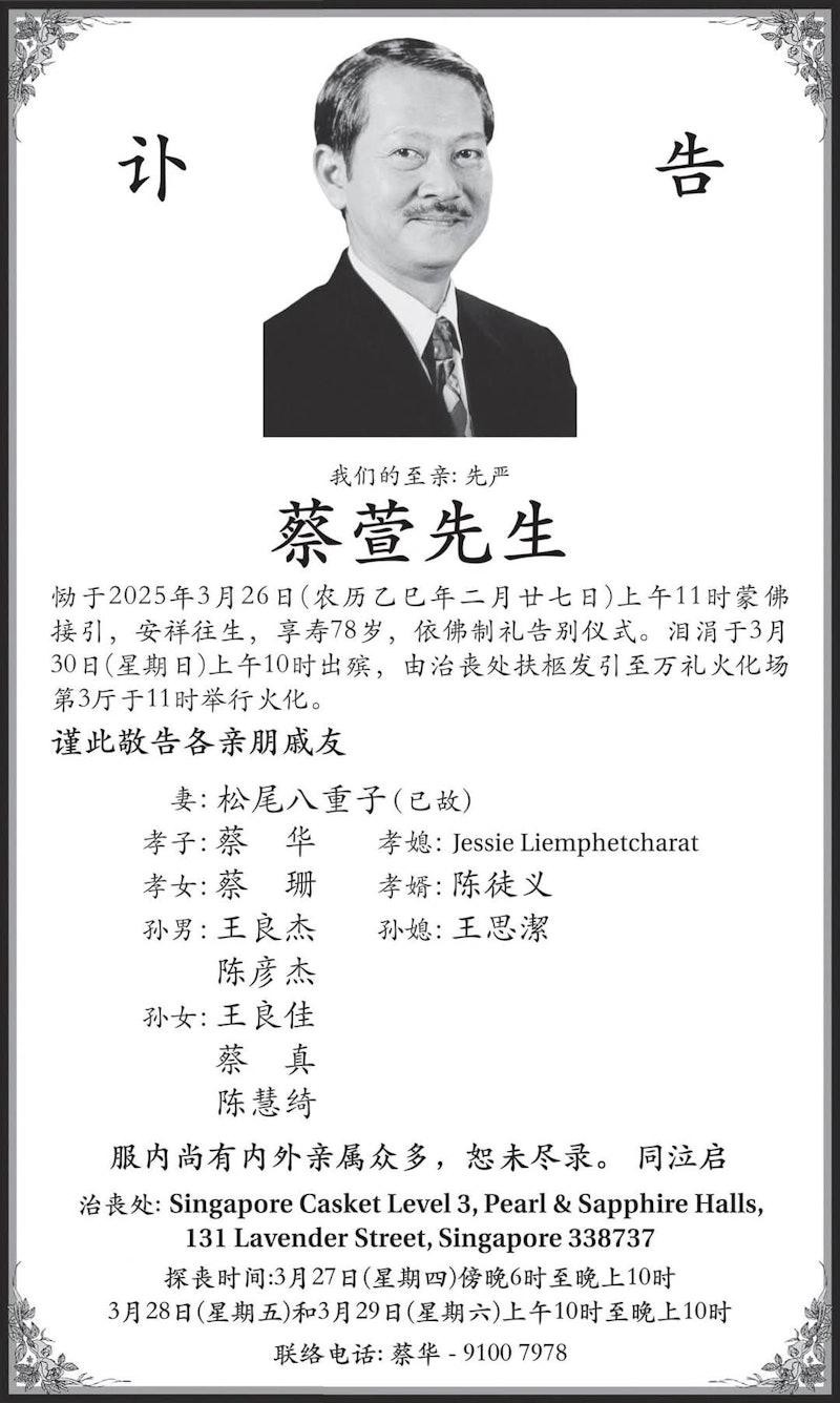 蔡萱是新加坡資深電視金牌監製,畢業自南洋大學及東京千代田電視學院。他投身電視行業後,共製作了超過200部電視劇。 蔡瀾在家中排行第三,蔡萱排第四。蔡瀾一向與萱感情要好,曾公開讚賞弟弟十分孝順:蔡瀾的大姐和大哥各自有家庭要照顧,蔡瀾則長期在海外,因此自父親去逝後,蔡萱便負起照顧母親的重任。 蔡萱之子蔡華則認為,父親是個處處為他人著想的“好好先生”,與兄長蔡瀾一樣熱愛美食,父親在世時,曾多次去香港探望身體欠佳的蔡瀾。(完) 【編輯:譚暢】