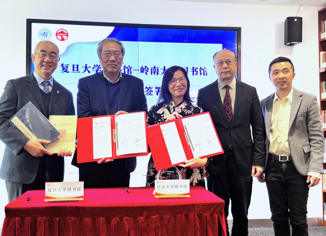 香港新聞網3月31日電 香港嶺南大學圖書館與復旦大學圖書館日前在復旦大學邯鄲校區文科圖書館舉行“復旦—嶺南大學圖書館合作備忘錄”簽署儀式。此合作協定標誌著嶺大與復旦大學簽訂首份合作協議,旨在建立更緊密的合作關係,並推動雙方優勢互補,促進兩校在更廣泛領域展開深入交流。 合作備忘錄於2025年3月28日在嶺大學術暨教務副校長及林文贊科學計算講座教授陳漢夫教授和復旦大學黨委常委、副校長陳志敏教授,以及復旦大學港澳台辦事務辦公室沈國麟主任的見證下,由嶺大資訊科技總監及大學圖書館館長林美珍博士與復旦大學圖書館館長陳引馳教授代表雙方簽署協議,為兩館合作奠定堅實的基礎。