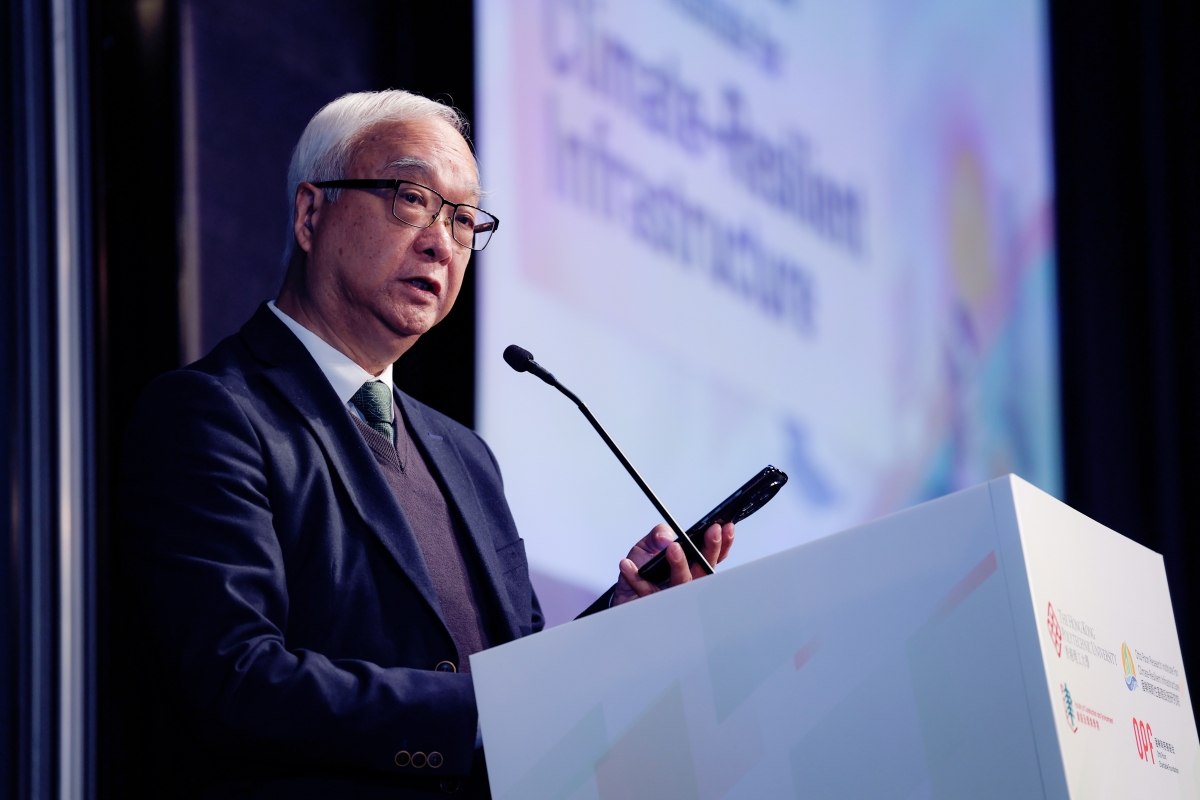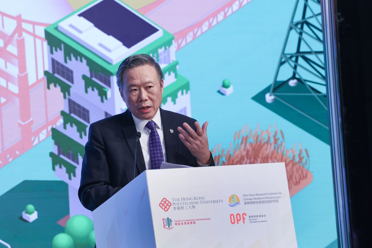 謝展寰在致辭中闡述了政府為在2050年前實現碳中和所制定的減碳策略及措施以及以及加強氣候適應能力和韌性的相關努力。(香港中通社記者 徐文峰攝) 香港特區環境及生態局局長謝展寰在致辭中詳細闡述了政府為在2050年前實現碳中和所制定的減碳策略及措施,並強調了在綠色科技與綠色金融領域取得的進展。他說:“建設具氣候韌性的城市至關重要——這不僅關乎保護我們的財產,更關乎保護我們的生命。在慶祝理大潘樂陶韌性基礎設施研究院成立之際,讓攜手建構一個具氣候韌性的香港,為下一代締造新的生態文明。”