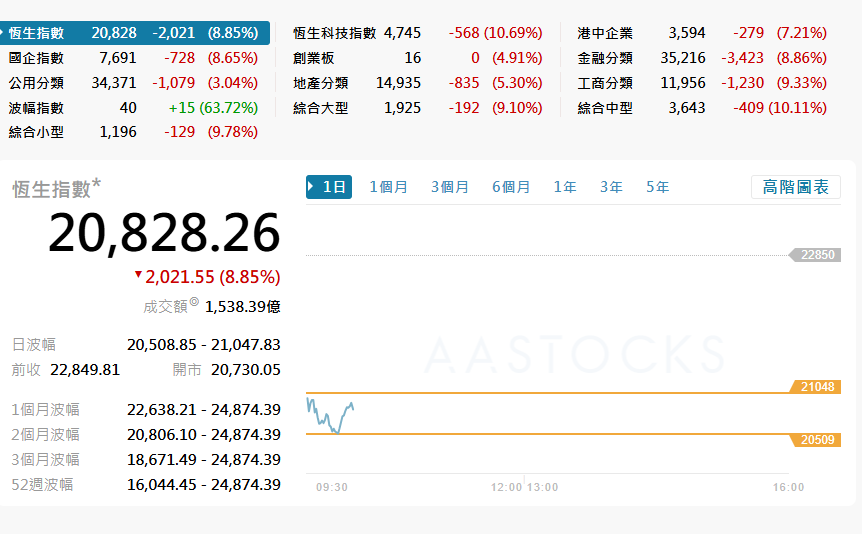 圖源:aastocks 截至當日上午10時許,恆指最新報20828點,跌2021點或8.85%。國指跌728或8.65%;科指跌568或10.96%。 值得留意的是,《人民日報》當日發表評論文章指,加徵關稅將嚴重抑制雙邊貿易,短期內不可避免地對中方出口造成負面影響,加大經濟下行壓力,但“天塌不下來”,未來根據形勢需要,降準、降息等貨幣政策工具隨時可以出台。(完) 【編輯:譚暢】
