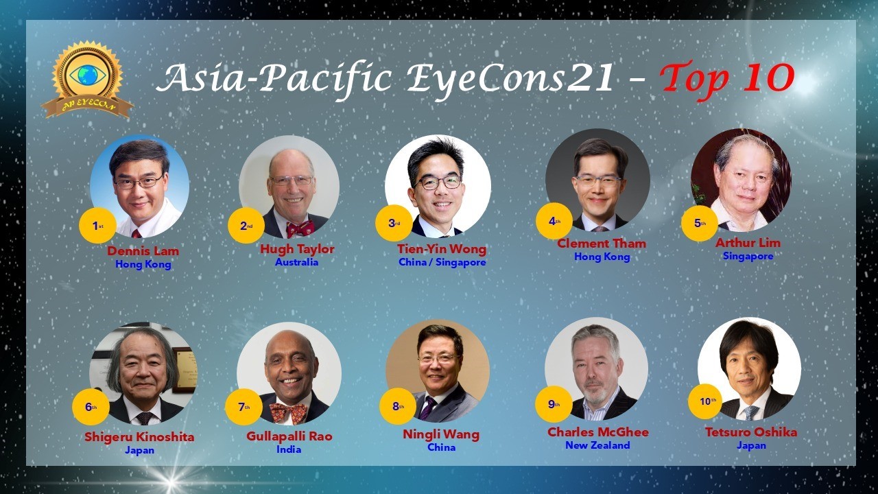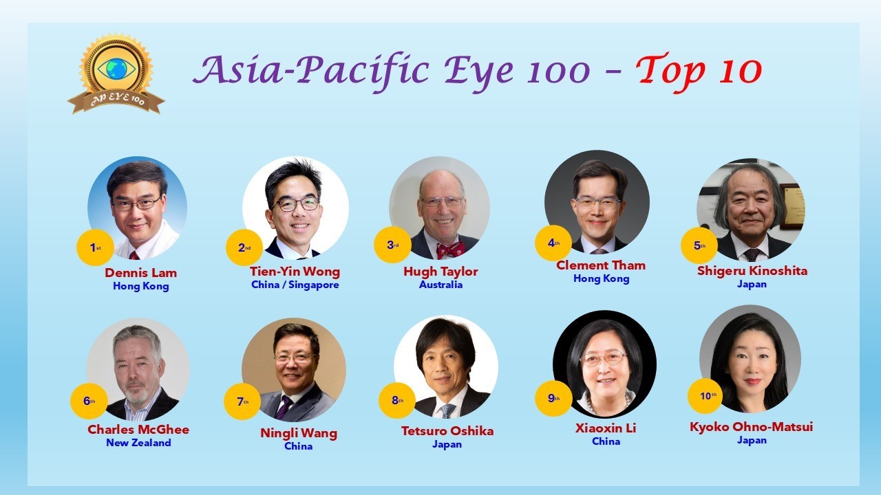 今次一共有20位獲獎者,其中包括五位已故的眼科重要領袖:中國的趙家良、新加坡的林少明(Arthur Lim)、日本的Akira Nakajima和Yasuo Tano,以及印度的SS Badrinath教授,以表彰他們對眼科發展的貢獻和產生的深遠影響。榜單中,來自中國和中國香港的5位專家脫穎而出,名列十強的有4位,分別有香港中文大學(深圳)林順潮教授榮登榜首,清華大學的黃天蔭教授(第三名)、香港中文大學譚智勇教授(第四名)、北京同仁醫院王寧利教授(第八名)。