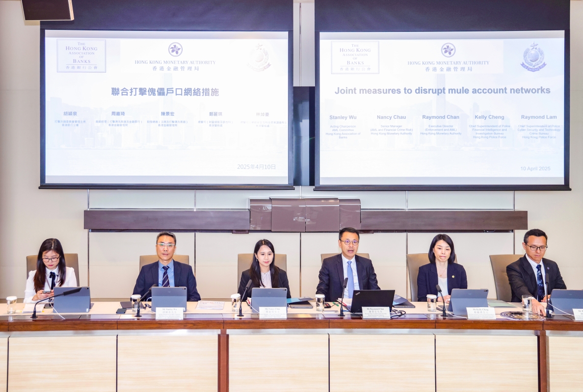 香港新聞網4月10日電。(記者 曹文毓) 4月10日,香港金融管理局、香港警務處及香港銀行公會在國際金融中心舉行新聞發布會,講解聯合打擊傀儡戶口網絡的措施。金管局助理總裁陳景宏表示,五項新措施包括向銀行公開防騙伺服器紀錄內的可疑電話號碼及電郵地址,如有客戶要求轉錢入相關戶口,銀行可以考慮是否進一步審查。當局提出銀行業修訂條例草案,希望推動銀行之間分享戶口資料,如立法進度順利,會爭取年底前落實措施。 發布會由香港銀行公會打擊洗錢委員會署理主席胡穎泉、香港金管局高級經理(打擊清洗黑錢)周嘉琦、香港金管局助理總裁(法規及打擊清洗黑錢)陳景宏、香港警務處總警司(財富情報及調查科)鄭麗琪以及總警司(網絡安全及科技罪案調查科)林焯豪主持。
