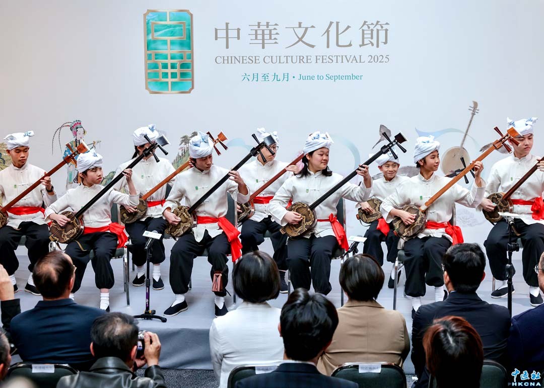 4月7日,香港康文署舉行“中華文化節2025”節目簡介會。“中華文化節2025”將於六月至九月期間舉行,其間將舉辦超過280場表演藝術節目及一系列精心策劃的延伸活動、電影放映、展覽,以及社區和校園活動,並邀得多個內地頂尖藝團和藝術家來港演出並進行文化交流。圖為本地青年三弦演奏家進行示範演出。(香港中通社記者 謝光磊攝)
