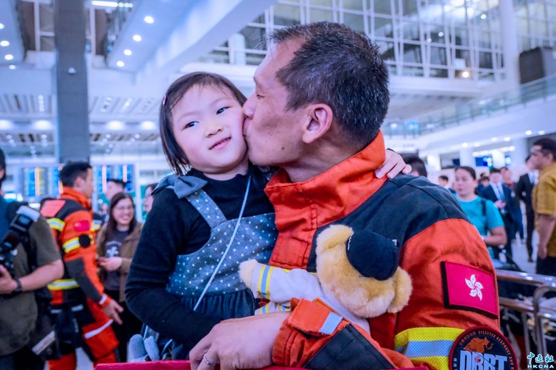 香港特別行政區救援隊完成緬甸地震災區搜救任務返港,特區政府4月9日在香港國際機場為隊員舉行迎接儀式。圖為救援隊員與家人團聚。(香港中通社記者 許其皓攝)