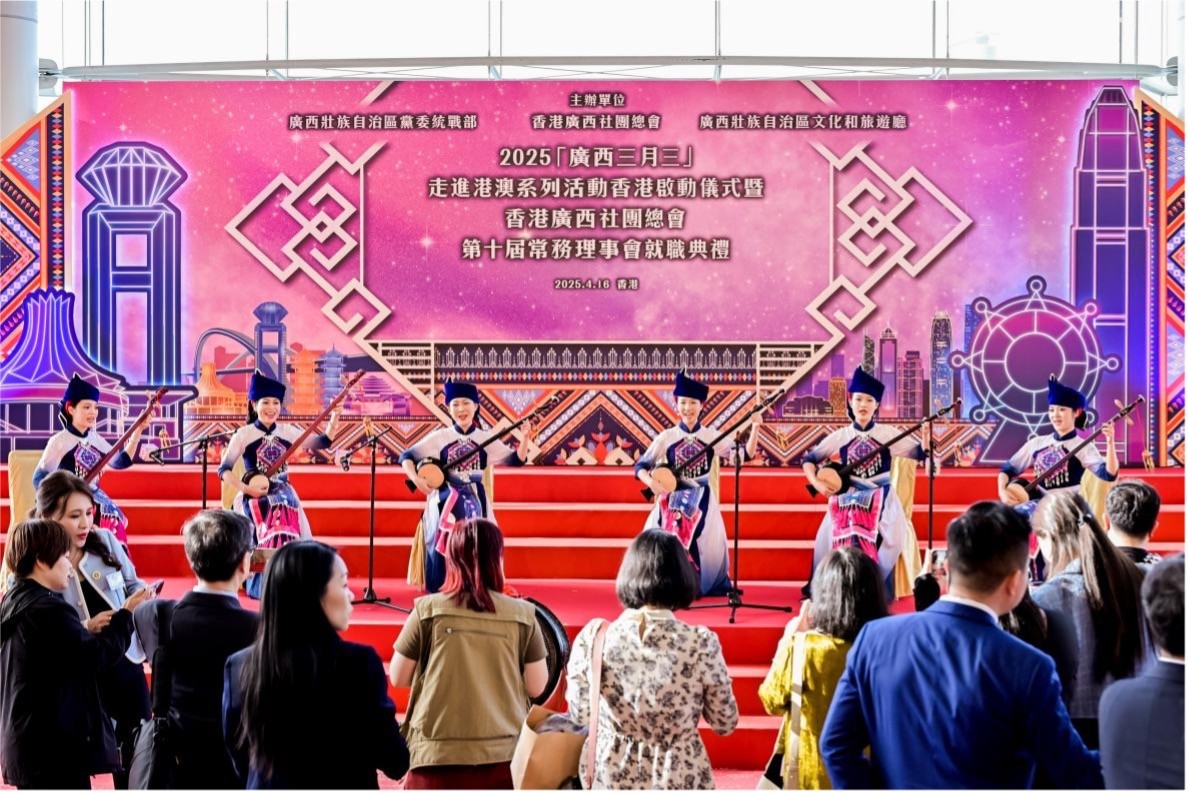 廣西“三月三”走進香港深化文旅交融香港新聞網4月17日電 2025年4月16日,由廣西壯族自治區黨委統戰部、香港廣西社團總會及廣西壯族自治區文化和旅遊廳聯合主辦的“2025‘廣西三月三’走進港澳系列活動香港啟動儀式暨香港廣西社團總會第十屆常務理事會就職典禮”在香港會議展覽中心隆重舉行。活動吸引了逾千名政商界代表、社團領袖及市民參與,共襄盛舉。