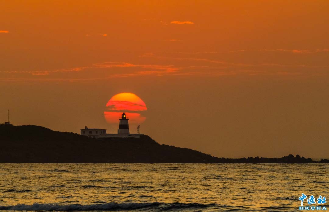 台灣新北市石門區富貴角燈塔懸日時間從2025年4月底到5月初,是欣賞浪漫美景最佳時機,吸引許多民眾及攝影愛好者紛紛聚集在石門漁港海堤,捕捉太陽與富貴角燈塔合而為一的精彩美景。香港中通社圖片
