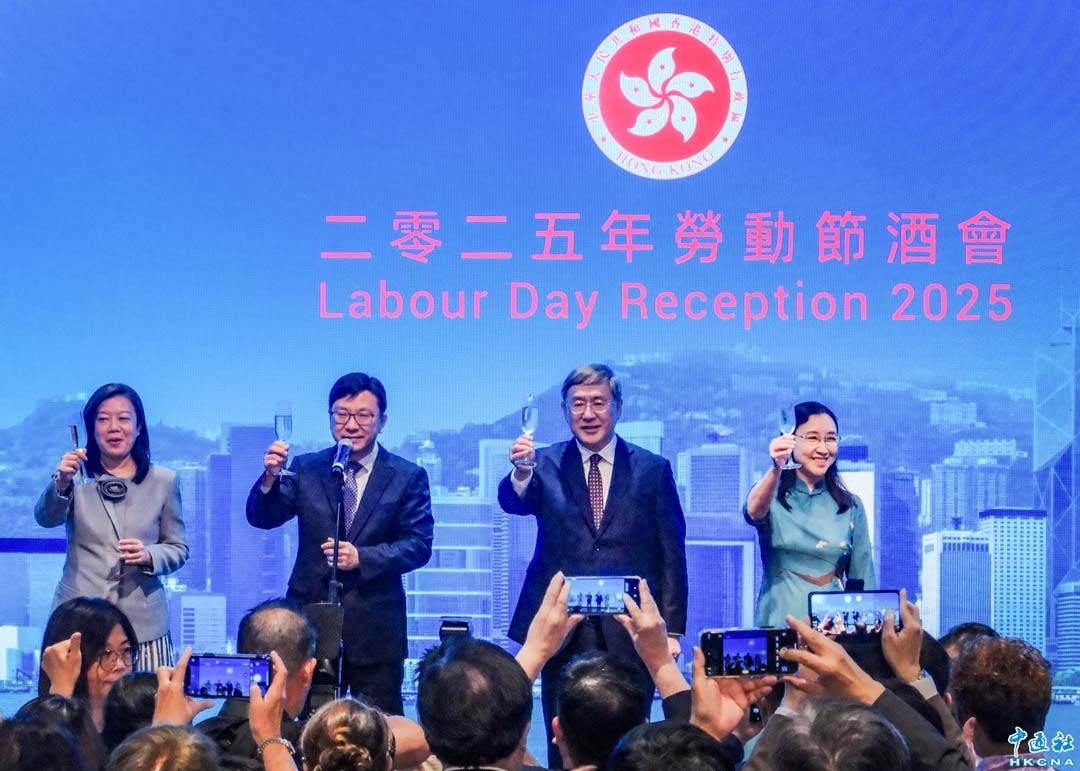 4月24日,香港勞工處在香港會展中心舉行勞動節酒會。圖為香港特區政府署理政務司司長卓永興(右二)、香港特區政府勞工及福利局局長孫玉菡(左二)、香港特區政府勞工及福利局常任秘書長劉焱(右一)及勞工處處長陳穎韶(左一)出席酒會。(香港中通社記者 許其皓攝)