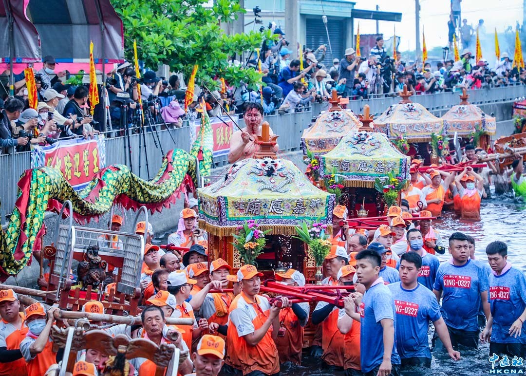 4月24日,台灣嘉義縣布袋鎮新塭嘉應廟舉辦已有兩百多年的歷史的”衝水路、迎客王“活動,是沿海地區一年一度的宗教文化盛事。據傳每年農曆3月27日,會有兩艘無形的王船來到嘉義,因此眾神就會出來迎接,盡地主之誼邀請入廟作客,祈求吉慶、國泰民安、風調雨順。 香港中通社圖片