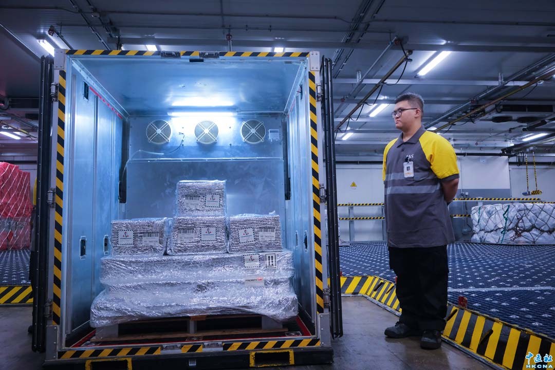 國泰航空位於香港國際機場的貨運站在25日的“機遇香港”活動期間開放予傳媒參觀,記者了解到,該公司在貨運上已啟用一系列人工智能(AI)輔助的設備,以保障航空安全及安全生產。圖為醫藥品冷鏈運輸。(香港中通社記者 許其皓攝)