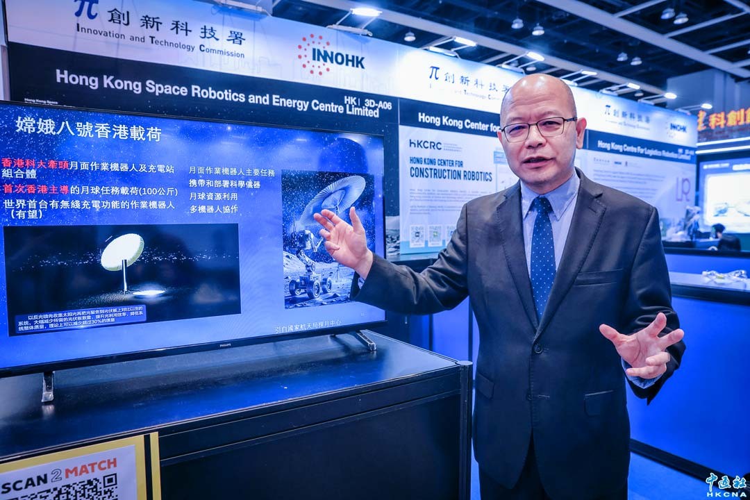 項目負責人、香港科大太空科學與技術研究院院長機械及航空航天工程學系于宏宇教授接受香港中通社獨家專訪,指出香港自研的機器人將協助伴嫦娥八號演練先期任務,包括部署科學儀器、月球資源利用、多機器人協作。(香港中通社記者 謝光磊攝)