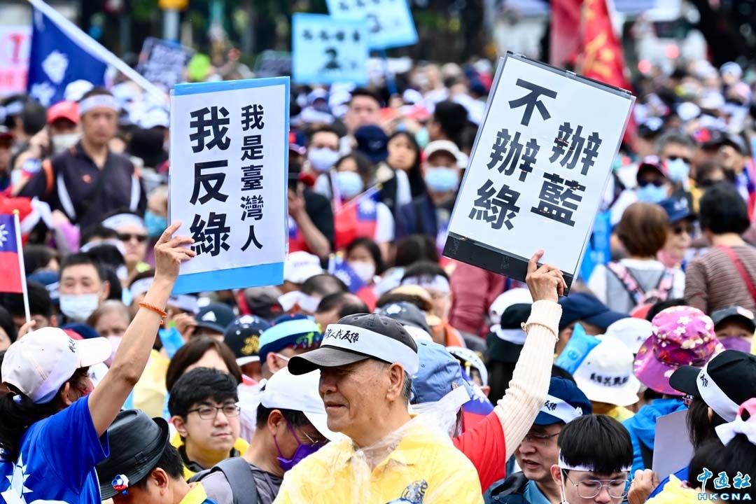 台灣中國國民黨4月26日下午在台北市凱達格蘭大道舉辦“戰獨裁”集會,國民黨主席朱立倫、民眾黨主席黃國昌、韓國瑜、台北市長蔣萬安、台中市長盧秀燕等人號召民眾上凱道抗議,在雨中以旗幟、毛巾等各種標語,表達訴求。 香港中通社圖片