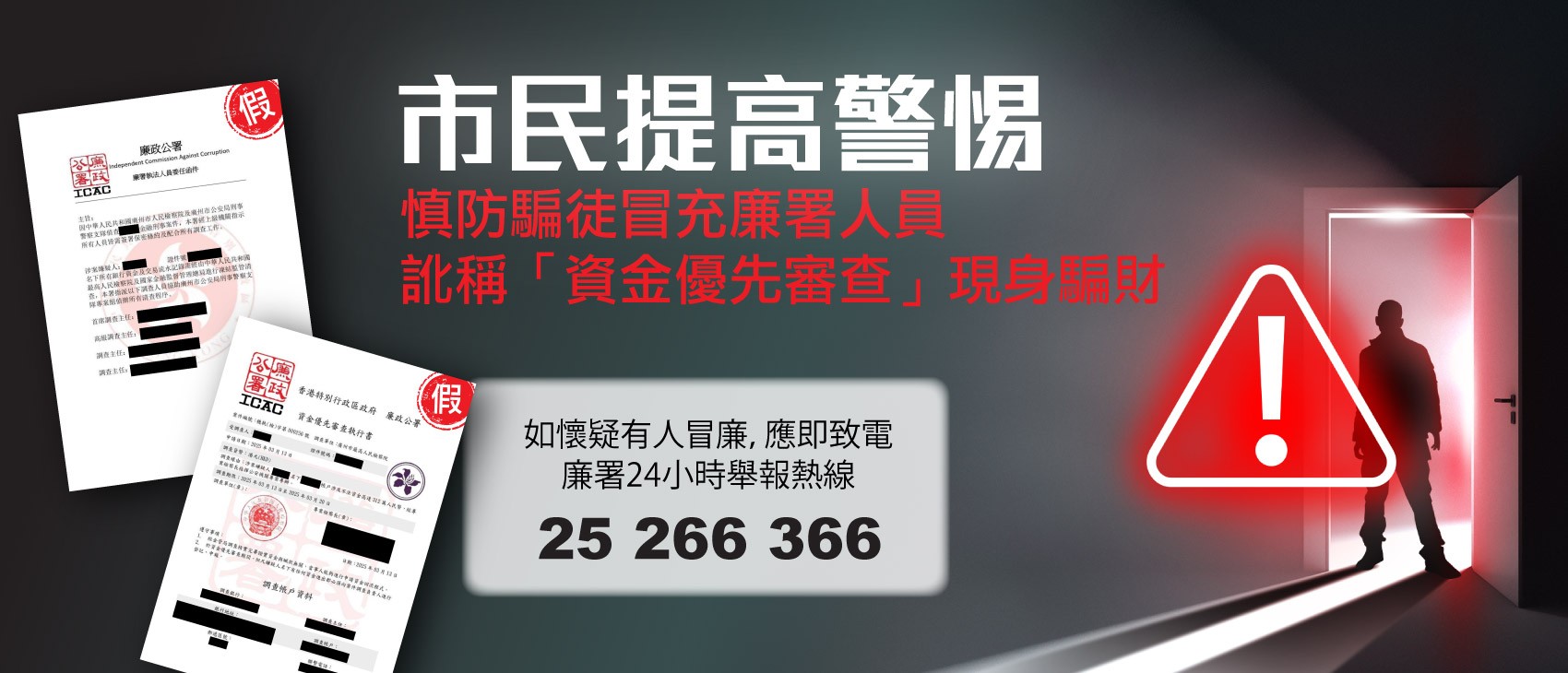 圖源:廉政公署 廉署呼籲公眾提高警覺,並再次重申廉署絕對不會要求市民提交金錢作“資金優先審查”或調查之用。 廉署近日接獲數宗涉及冒充廉署人員的投訴,受害人包括香港退休人士及大專學生。受害人先後接獲假冒內地官員的來電,指他們涉及洗黑錢、詐騙或其他刑事罪行正被內地公安及廉署調查。騙徒其後透過電話和短信要求受害人以銀行轉帳形式提交數十萬港元至過百萬港元之款項到廉署作“資金優先審查”,並訛稱會在完成調查後向受害人退還款項,過程中亦向受害人展示一些標題為“資金優先審查執行書”及“廉政公署執法人員委任函件”等偽造文件,令受害人受騙。 有受害人因未能透過銀行成功轉帳,騙徒便派人假冒廉署人員或內地官員到受害人住所或相約受害人在公眾地方見面,以現金方式收取騙款合共45萬。另外亦有受害人應不法之徒建議,自行於網上核對來電號碼,發現來電號碼與某內地公安單位相同,遂於兩星期內將多筆共約200萬港元的款項,存入騙徒提供聲稱為廉署人員的銀行帳戶。事實上,來電號碼已經被騙徒以改號技術更改,與某內地公安單位電話號碼相同,但來電根本並非來自內地公安單位。 受害人其後懷疑自己受騙,聯絡廉署而揭發事件。由於事件涉及冒認廉署人員,廉署已就事件展開調查。 廉署呼籲市民提高警覺,重申廉署絕對不會要求市民提交金錢作“資金優先審查”或調查之用。市民應慎防騙徒以不同形式冒認廉署人員,包括利用改號技術更改來電顯示號碼,假冒廉署或其他執法機關人員。市民如對來電、短信或電郵有所懷疑,應直接聯絡廉署或相關執法機關查詢。 (完) 【編輯:梁嘉軒】