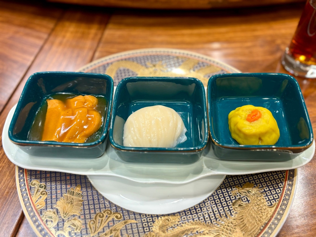 左起:黑毛豬叉燒、生拆鮮蝦餃皇、鮮蝦燒麥皇。(香港中通社記者 黃璇攝)