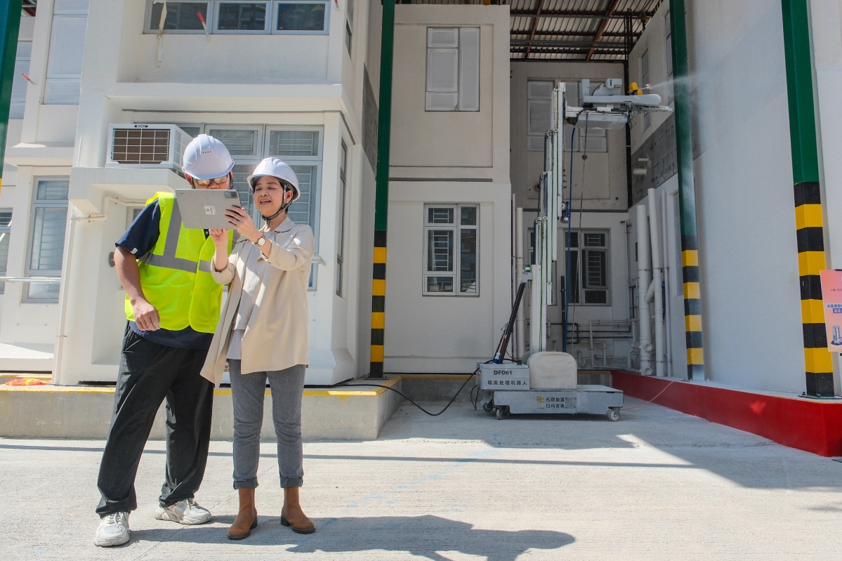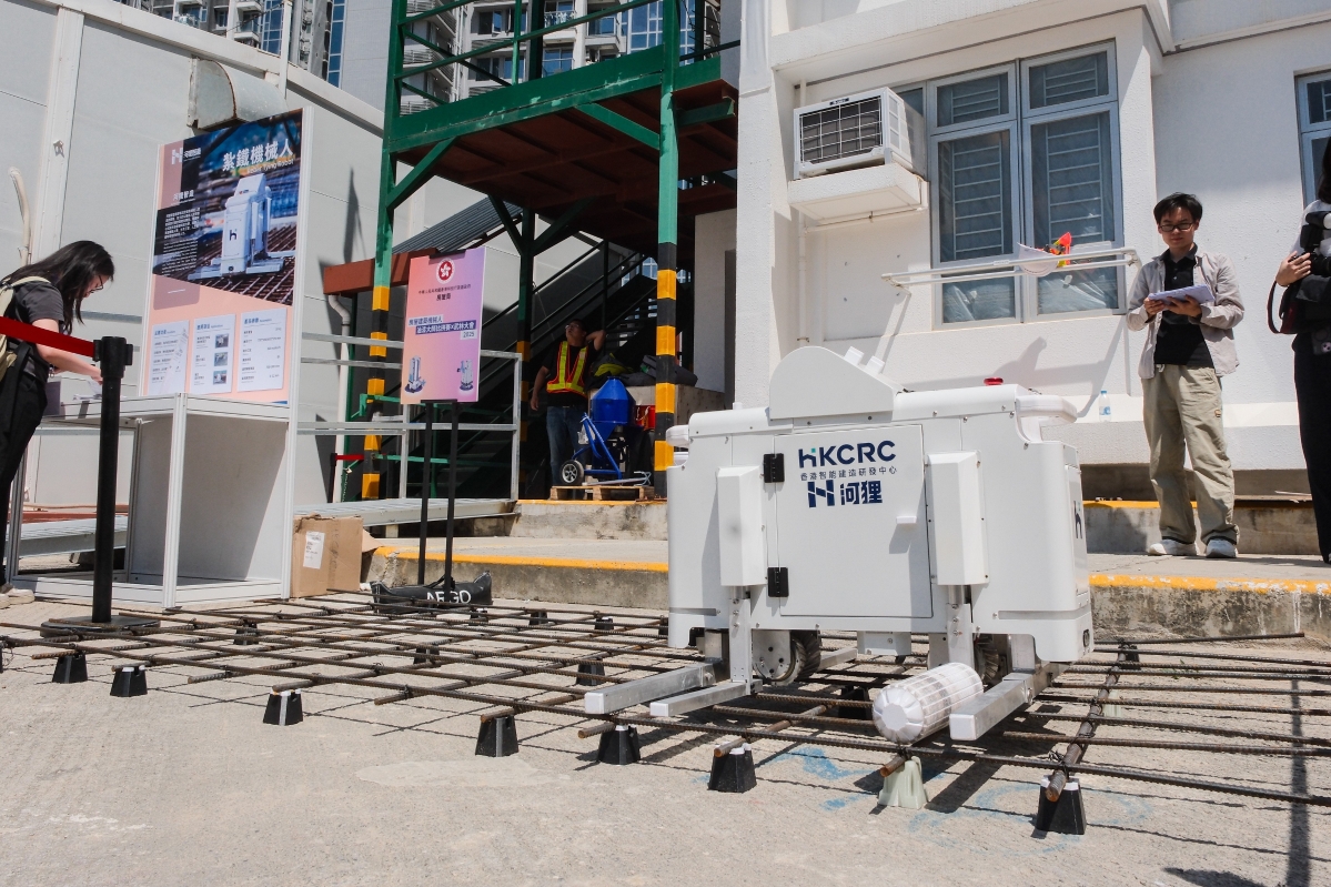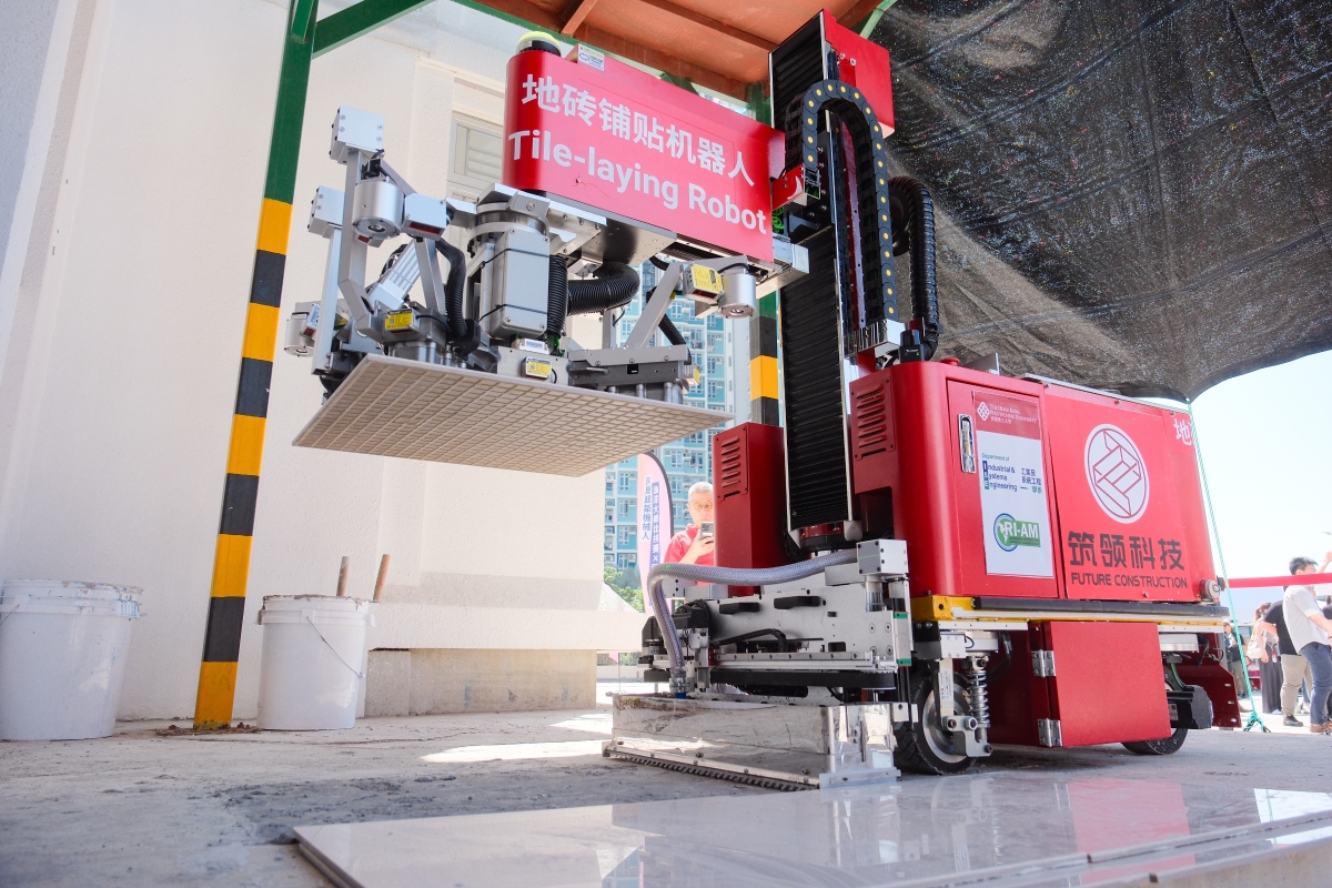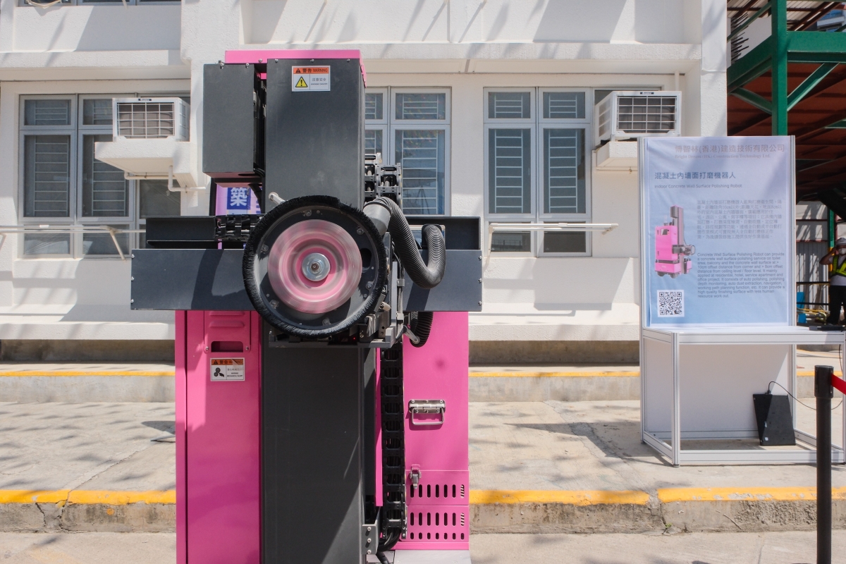 香港特區政府房屋局局長何永賢(右)示範操作6米墻面處理機械人。