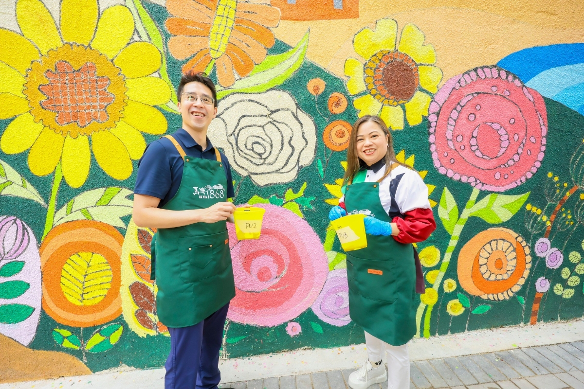 圖源:馬灣1868 Facebook 羅淑佩到園內參觀由多位藝術家創作的生動壁畫,更與新鴻基地產執行董事郭基煇親身在大型壁畫上色;與園內都市農莊交流有機種植發展,到訪藝術零售店了解文創產品,更在工作室親手彩繪獨一無二的招財貓擴香石,體驗創作的樂趣。
