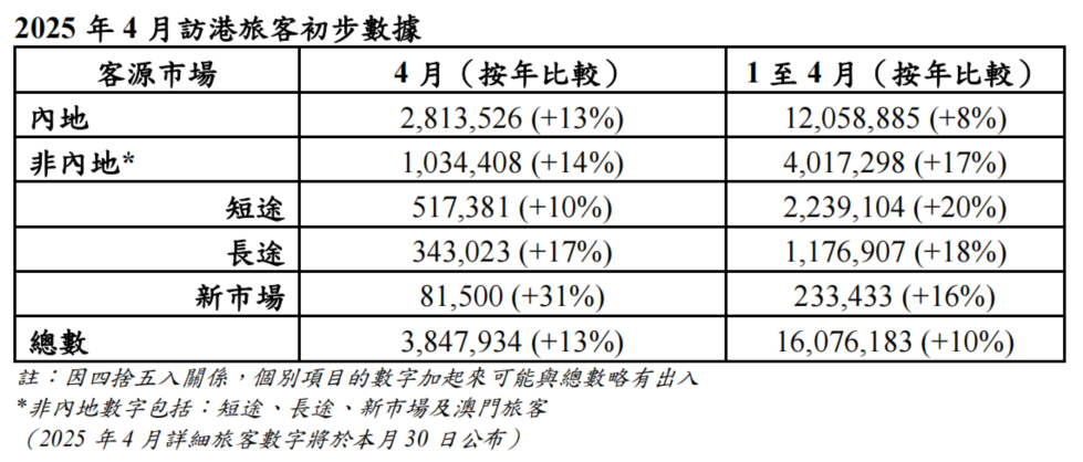 今年1至4月訪港旅客量多個客源市場的增長勢頭持續,其中來自中國台灣、日本、韓國、菲律賓及印尼的訪港旅客人次,均各較去年同期多超過 20%;澳大利亞的訪港旅客更錄得超過 30%的顯著增長。 其中,內地客源的訪港旅客量在1至4月為1206萬人次,較去年同期上升8%,新市場升幅的較為顯著,訪港旅客量在1至4月為23萬人次,較去年同期上升16%,其中4月按年升幅更達31%。 (完) 【編輯:梁嘉軒】