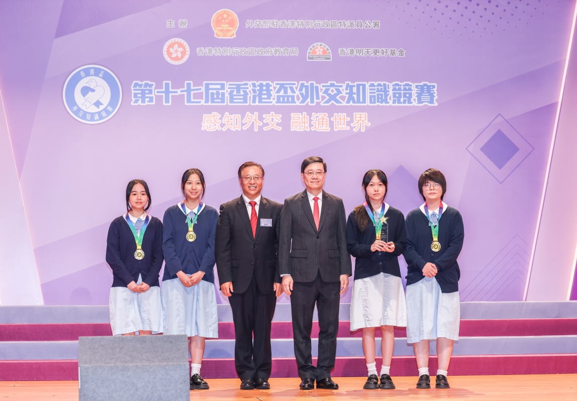 特首李家超(右三)、外交部駐港公署崔建春特派員(左三)與金獎獲得者
