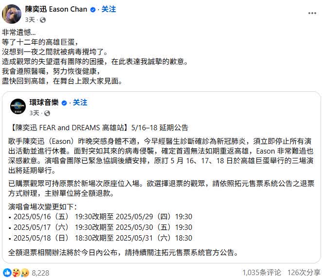 陳奕迅在社交平台親自向歌迷致歉:“非常遺憾,等了12年的高雄巨蛋,沒想到一夜之間就被病毒搞垮了。造成觀眾的失望還有團隊的困擾,在此表達我誠摯的歉意。我會遵照醫囑,努力恢復健康,盡快回到高雄,在舞台上跟大家見面。” 主辦方透露,Eason在演出前夕身體不適,經醫生診斷確診新冠,需立即停工休養。團隊考量歌手健康狀態與演出品質,決定延後首周3場演出。3場演出將順延至5月29日起舉行,已購票觀眾可持原票券於新場次同座位入場,無需換票,如需退票可依“拓元售票系統”公告辦理全額退費。主辦方呼籲觀眾妥善保管門票,並感謝大家的支持與體諒。(完) 【編輯:張明臻】